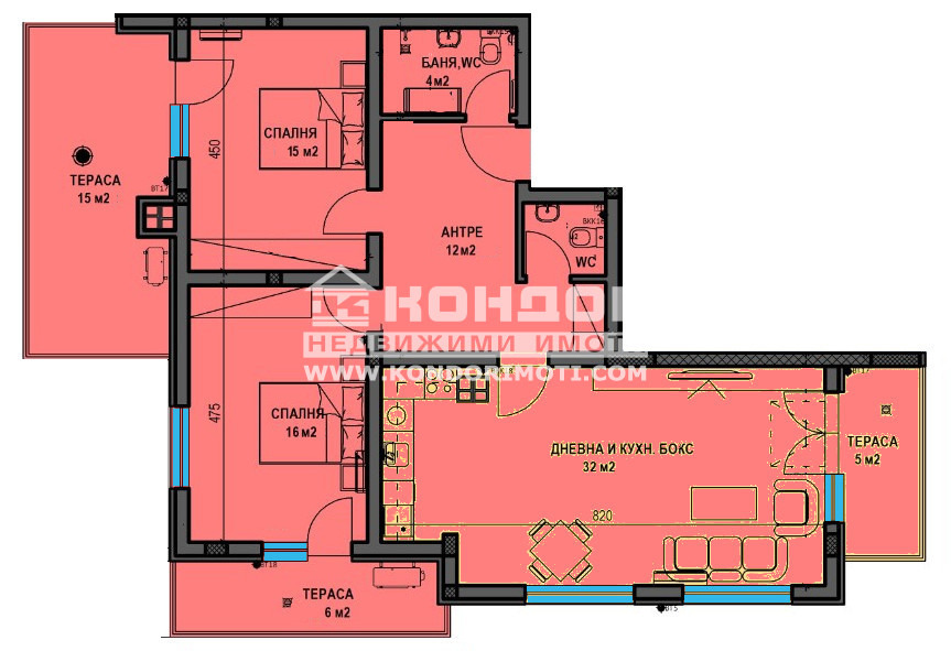 Оферта 61582: Представяме Ви новоизградена малка и луксозна сграда от типа на Фамилна къща, проектирана така, че да създаде максимален комфорт и уют. Сградата се намира на тихо и спокойно място в близост до всички необходими комуникации. Тристаен апартамент - състои се от ъглова югозападна дневна с трапезария и кухненски бокс 32кв.м. с излаз на тераса, две самостоятелни спални всяка с излаз на тераса: родителска 16кв.м. и детска 15кв.м., баня с тоалетна, втори санитарен възел и широко входно антре с място за гардероб. Към апартамента се закупува складово помещение на етажа на цена от 1200 евро/бр. Обектът е построен от фирма с доказан опит, като разполагаме с готови сгради и можем да Ви покажем качеството на изпълнение, което се осъществява с висококачествени материали и съвременни технологии, по европейски стандарт, петкамерна PVC дограма, червена Австрийска Тухла, масивна Блиндирана входна врата с 4-странно заключване, сензорно осветление, хидравлични асансьори с огледална кабина. Свободни подземни Гаражи и паркоместа в двора!!! Възможност за Закупуване чрез Банков Кредит!!!Възползвайте се от възможността да живеете в малка бутикова сграда!!!