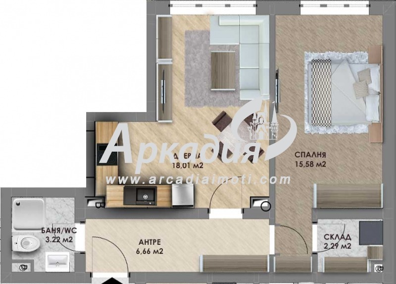 Апартаментът е със следното разпределение: дневна с трапезария и кухненски бокс, спалня, баня с тоалетна, складово помещение, входно антре.