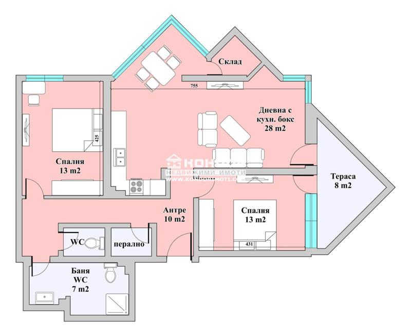 Оферта 56189: АКТ 16!!! Предлагаме Ви да закупите тристаен нов южен апартамент в новоизградена сграда, намираща се в престижен и предпочитан район. Перфектна локация в близост до училища и детски градини, хранителни хипермаркети и удобен градски транспорт. Жилището се състои от дневна с трапезария с кухненски бокс - 28 м2,спалня - 13 м2, една тераса обща за двете стаи - 8 м2, втора спалня - 13 м2, баня с тоалетна - 7 м2, второ санитарно помещение, обособено перално, килер и удобен коридор. В цената е включено избено помещение. Комплексът се отличава с прецизно строителство, съобразено с всички съвременни изисквания, хидравличен асансьор, топло и хидро изолация, червена тухла, PVC дограма, масивна блиндирана входна врата. Чудесната локация и висококачественото изпълнение, отговарят изцяло на нуждите от градско жилище на съвременния човек с активен начин на живот. Свободни подземни гаражи и надземни паркоместа!!! Възможност за Банков кредит на преференциални условия за клиенти на агенцията!!!