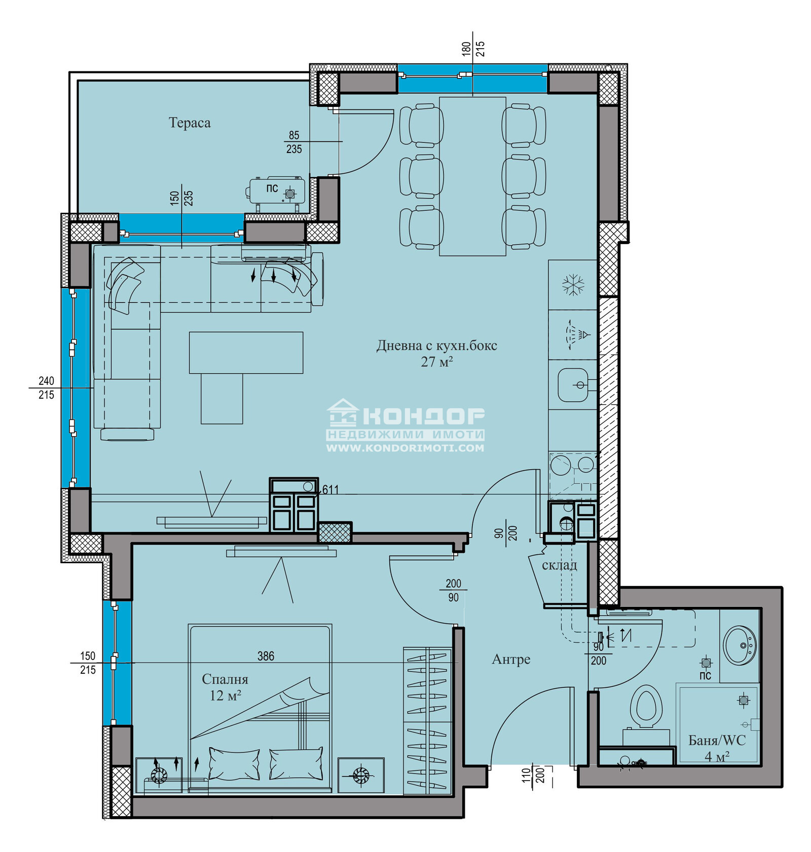 Оферта 63565: Имаме Удоволствието да ви Предложим Функционален Двустаен Апартамент в луксозна сграда, отличаваща се с модерна и съвременна архитектура в един отлично развиващ се район за живеене райони с отлична локация в близост до Училища, детски градини, удобен транспорт към централна градска част и големи хипермаркети. Проектът е с нисък процент общи части, което дава възможност на клиентите да получат повече реална площ !!! Жилището се състои от слънчева светла ъглова дневна 27кв.м. с трапезария и кухненски бокс, една самостоятелна спалня 12кв.м., баня с WC, входно антре с място за гардероб и една тераса. Сградата се изпълнява от реномирана Строителна Компания, която разполага с множество готови обекти, утвърдила се като една от водещите и Коректни Фирми в Града. Апартаментите ще бъдат завършени според всички изисквания за съвременно строителство - блиндирана врата, 6-камерна дограма, МДФ-вътрешни врати. Луксозни общи части, хидро и топло изолация, хидравличен асансьор, гранитено стълбище, алуминиев парапет. Свободни Подземни Гаражи и външни Паркоместа . Сградата се намира на Отлично и предпочитано място като локация - ОТЛИЧНА ИНВЕСТИЦИЯ !!! Възможност за изплащане на разсрочено плащане в рамките на строителството.ВИЖТЕ ОЩЕ ИЗГОДНИ ОФЕРТИ НА https://www.kondorimoti.com/ С ЕЖЕДНЕВНА АКТУАЛИЗАЦИЯ!