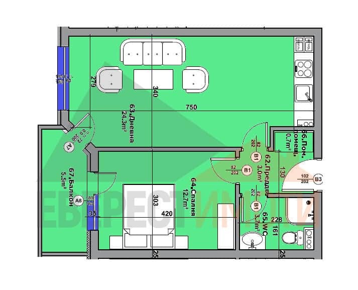 Оферта: 2318. Mалка и бутикова сграда MIRAGE, едно ново бижу, което се намира на чудесно място в района, обединяваща спокойствие, сигурност, лукс и чудесно местоположение. Предлагаме Ви чудесен ДВУСТАЕН АПАРТАМЕНТ с възможност за закупуване на ПАРКОМЯСТО във вътрешен двор или ГАРАЖ. СГРАДАТА е с модерна архитектура, с визия прилягаща за квартала. Апартаментът се състои от голяма дневна с трапезария и кухненски бокс, една спалня, баня с тоалетна, входно антре, склад и една прекрасна тераса. Строителството е прецизно с много високо качество на изпълнение и използвани материали: керамична тухла, немска 5-камерна дограма с мултифункционално стъкло, дизайнерско стълбище/виж галерия/ от естествен камък и облицовка на фасадата, 10 см. външна топлоизолация БАУМИТ, парапети на стълбището и терасите от ковано желязо и алуминий, блиндирани входни врати с тристранно заключване, безшумен асансьор ОРОНА, домофонна система с видеонаблюдение, декоративни елементи по фасадата, LED осветление по общи части и фасада и много други екстри за живущите. Жилищата се издават на шпакловка и замазка с изградена ел. инсталация с контакти и ключове, ВиК на тапа. Мястото е тихо и много спокойно, като в близост има зеленчуков пазар, детска градина, училище, болница и автобусни спирки. ЧУДЕСЕН за инвестиция и живене поради близостта си до големи университети. Разсрочено плащане в рамките на строителството. Агенция ЕВЕРЕСТ ИМОТИ съдейства за закупуването чрез банков кредит от водещи банки на преференциални условия за клиентите си!!