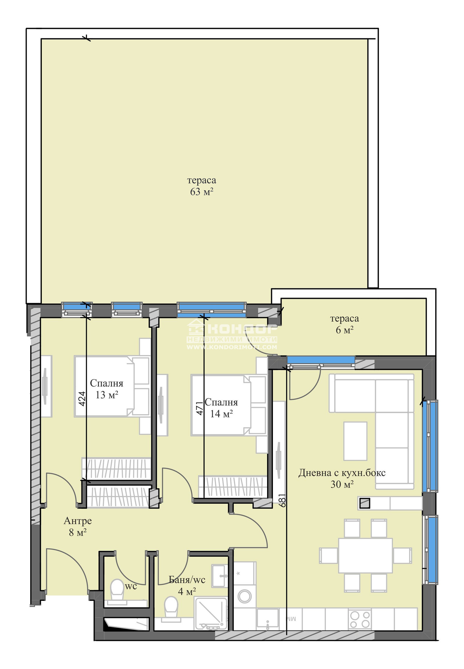 Оферта 64627: Представяме Ви нов проект вдъхновен от най-добрите имоти на европейския пазар, представляващ комбинация между удобно разположен дом, качествено строителство и зелени пространства. СПЕЦИАЛНО ПРЕДЛОЖЕНИЕ- сгради с нисък % общи части. Нов, модерен проект представляващ две жилищни сгради в един общ ограден двор и много зелени площи . Разпределения - Просторни и много функционални апартаменти с просторни стаи и гледка към Стара планина, а също и с партерни жилища с двор и такива с големи панорамни тераси. Апартаментът който Ви предлагаме се състои от просторна дневна с кухненски бокс с две изложения 30 кв.м., две самостоятелни спални, две санитарни помещения, голям коридор и прекрасна тераса. Материали - Жилищната сграда е изградена съгласно най-високите технологични изисквания за качество и лукс. Използваните материали са съобразени с най-новите тенденции в строителството - модерна външна облицовка, покривна и фасадна изолация, PVC пет камерна дограма и др. Луксозните общи части фотоклетки и безшумен асансьор, допринасят допълнително за усещането за лукс и комфорт на обитателите. За удобството на своите собственици, сградата разполага с гаражи и паркоместа. Проектът е предназначен за модерния забързан човек търсещ удобствата на града ,но в тиха и спокойна среда далеч от шума и мръсния въздух.