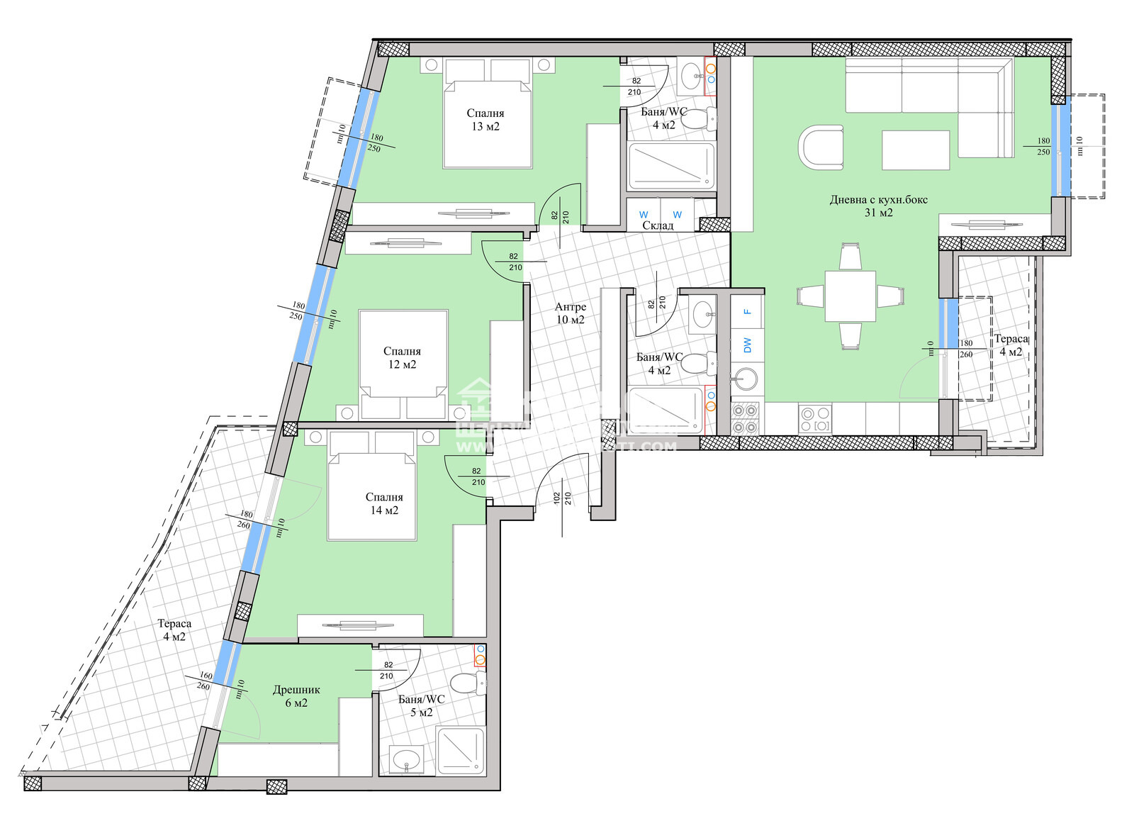 Разпределение: функционален многостаен апартамент, състои се от входно антре, слънчева дневна 31кв.м. с трапезария и кухненски бокс, три самостоятелни спални: гостна спалня 13кв.м. със собствена баня, детска стая 12кв.м., родителска спалня 14кв.м. със голям дрешник 6кв.м. и собствена баня, трета баня с тоалетна, склад/перлано и две панорамни тераси.