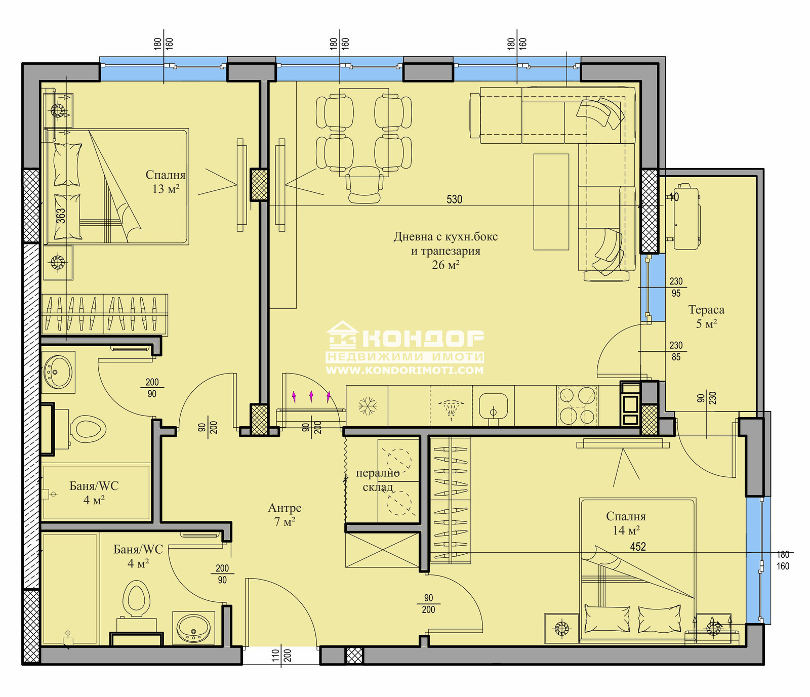 - Разпределение: Тристаен функционален апартамент състоящ се от ъглова дневна 26кв.м. с кухненски бокс и трапезария, две прекрасни самостоятелни спални: родителска 13кв.м. със самостоятелна баня, детска 14кв.м., втора баня с тоалетна, входно антре, перално и една тераса.