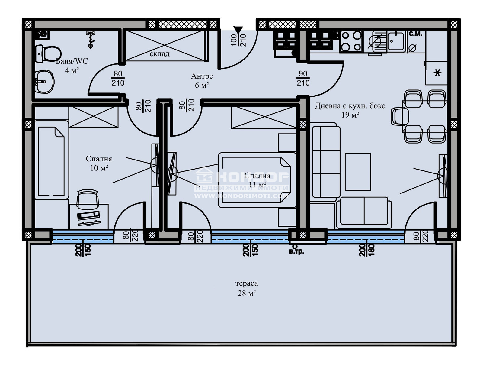 БЕЗ КОМИСИОН ОТ КУПУВАЧА!!! Предлагаме Ви възможността да си закупите тристаен апартамент в нискоетажна жилищна сграда намираща се на тихо и спокойно място в близост до всички необходими комуникации, училища, детски градини, удобен транспорт и големи хранителни хипермаркети. Сградата е проектирана проектирана с изключително нисък процент общи части - 10%, което дава повече реална и използваема площ на стаите и създава максимален комфорт на своите ползватели. Жилището се състои от дневна с кухненски бокс, две самостоятелни спални, баня с тоалетна, перално, входно антре и една панорамна тераса 28кв.м. с достъп от всички стаи. Перспективна ИНВЕСТИЦИЯ ЗА ОТДАВАНЕ ПОД НАЕМ!!! Изпълнението се осъществява с висококачествени материали и съвременни технологии, по европейски стандарт, шест камерна PVC дограма, блиндирана входна врата с 4-странно заключване, сензорно осветление, хидравлични асансьори с огледална кабина. Свободни Паркоместа на цени от 8000 евро и партерни Гаражи !!! Приложените снимки са от друга готова сграда на строителната фирма. Възможност за закупуване на разсрочено плащане в рамките на строителството или чрез Банков Кредит на изключително изгодни условия, договорени за клиенти на Агенция КОНДОР !!!ВИЖТЕ ОЩЕ ИЗГОДНИ ОФЕРТИ НА https://www.kondorimoti.com/ С ЕЖЕДНЕВНА АКТУАЛИЗАЦИЯ!