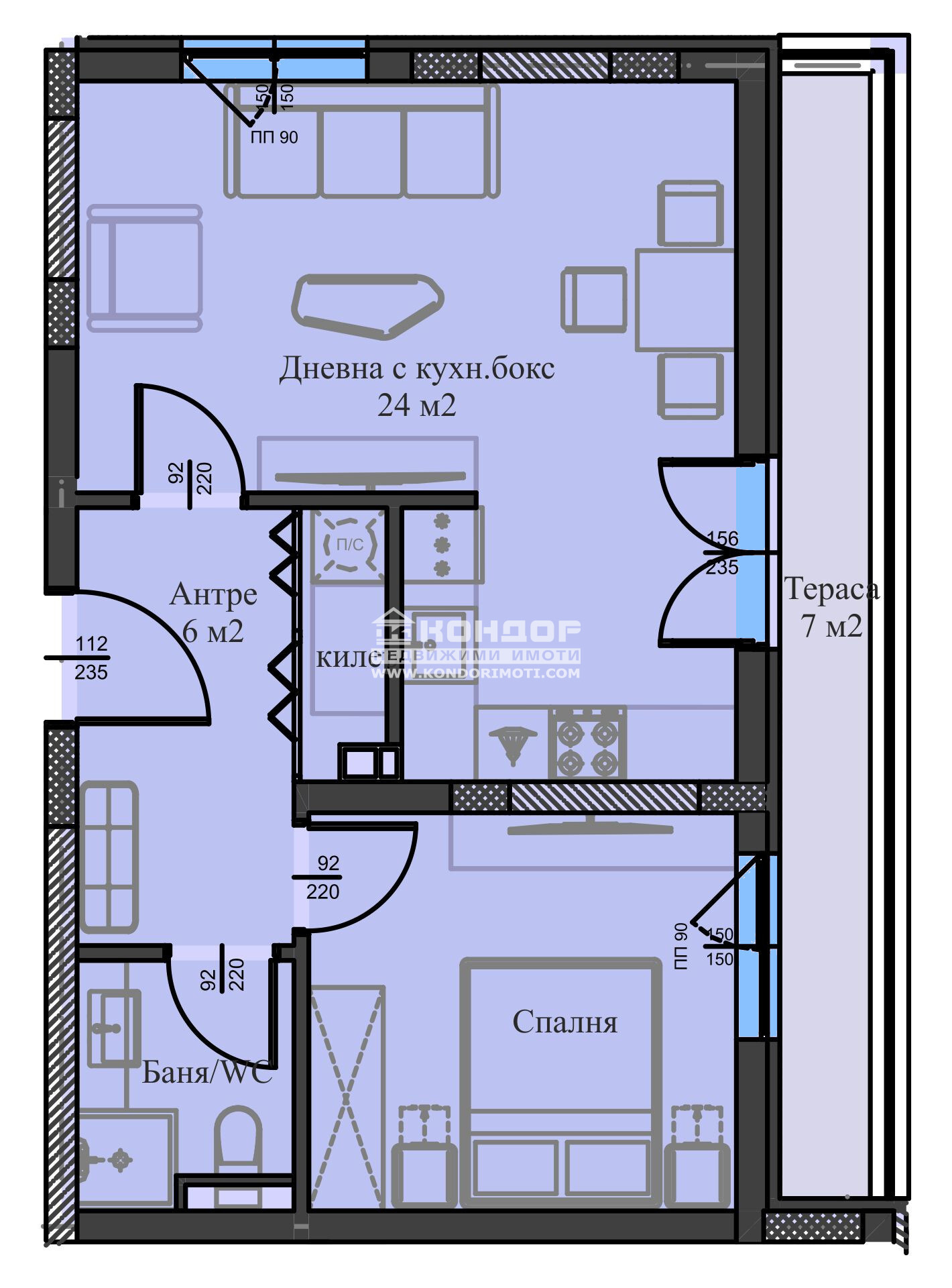 Разпределения - Предлагаме на Вашето внимание двустаен апартамент, състоящ се от светла ъглова дневна с трапезария и кухненски бокс - 24 м2, самостоятелна спалня, баня с тоалетна, входно антре, килер/перално и една обща панорамна тераса.