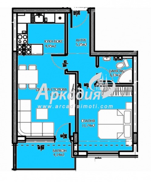Стаите са функционално разпределени по следния начин - просторна и слънчева дневна с кухненски бокс, спалня, входно антре, баня с тоалетна и една тераса.