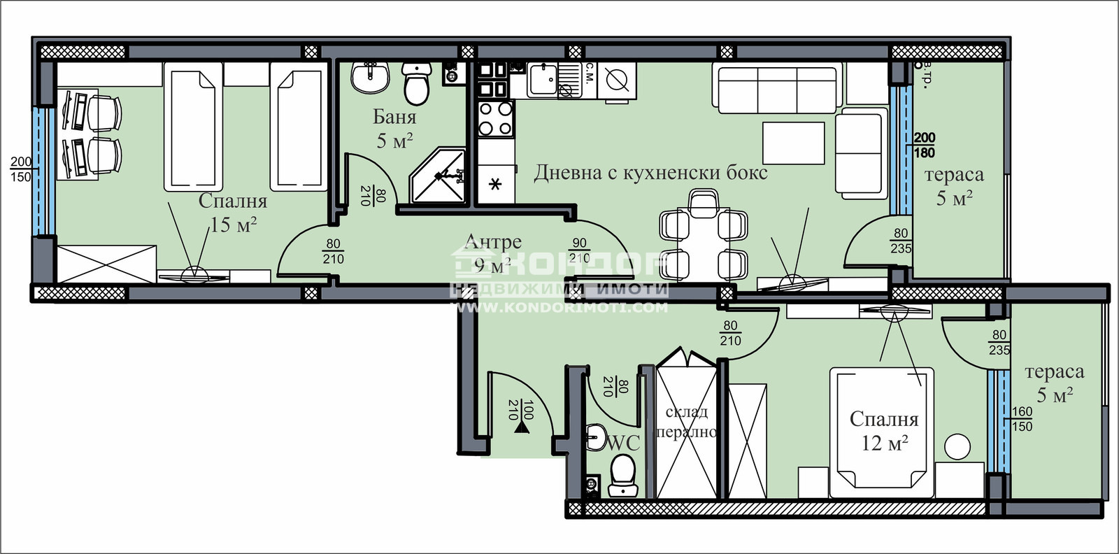 БЕЗ КОМИСИОН ОТ КУПУВАЧА!!! Предлагаме Ви възможността да си закупите тристаен апартамент в нискоетажана жилищна сграда намираща се на тихо и спокойно място в близост до всички необходими комуникации, училища, детски градини, удобен транспорт и големи хранителни хипермаркети. Сградата е проектирана проектирана с изключително нисък процент общи части - 10%, което дава повече реална и използваема площ на стаите и създава максимален комфорт на своите ползватели. Жилището се състои от дневна с кухненски бокс, две самостоятелни спални 12 и 15кв.м., баня с тоалетна, втора тоалетна, склад, входно антре и две тераси. Перспективна ИНВЕСТИЦИЯ ЗА ОТДАВАНЕ ПОД НАЕМ!!! Изпълнението се осъществява с висококачествени материали и съвременни технологии, по европейски стандарт, шест камерна PVC дограма, блиндирана входна врата с 4-странно заключване, сензорно осветление, хидравлични асансьори с огледална кабина. Свободни Паркоместа на цени от 8000 евро и партерни Гаражи !!! Приложените снимки са от друга готова сграда на строителната фирма. Възможност за закупуване на разсрочено плащане в рамките на строителството или чрез Банков Кредит на изключително изгодни условия, договорени за клиенти на Агенция КОНДОР !!