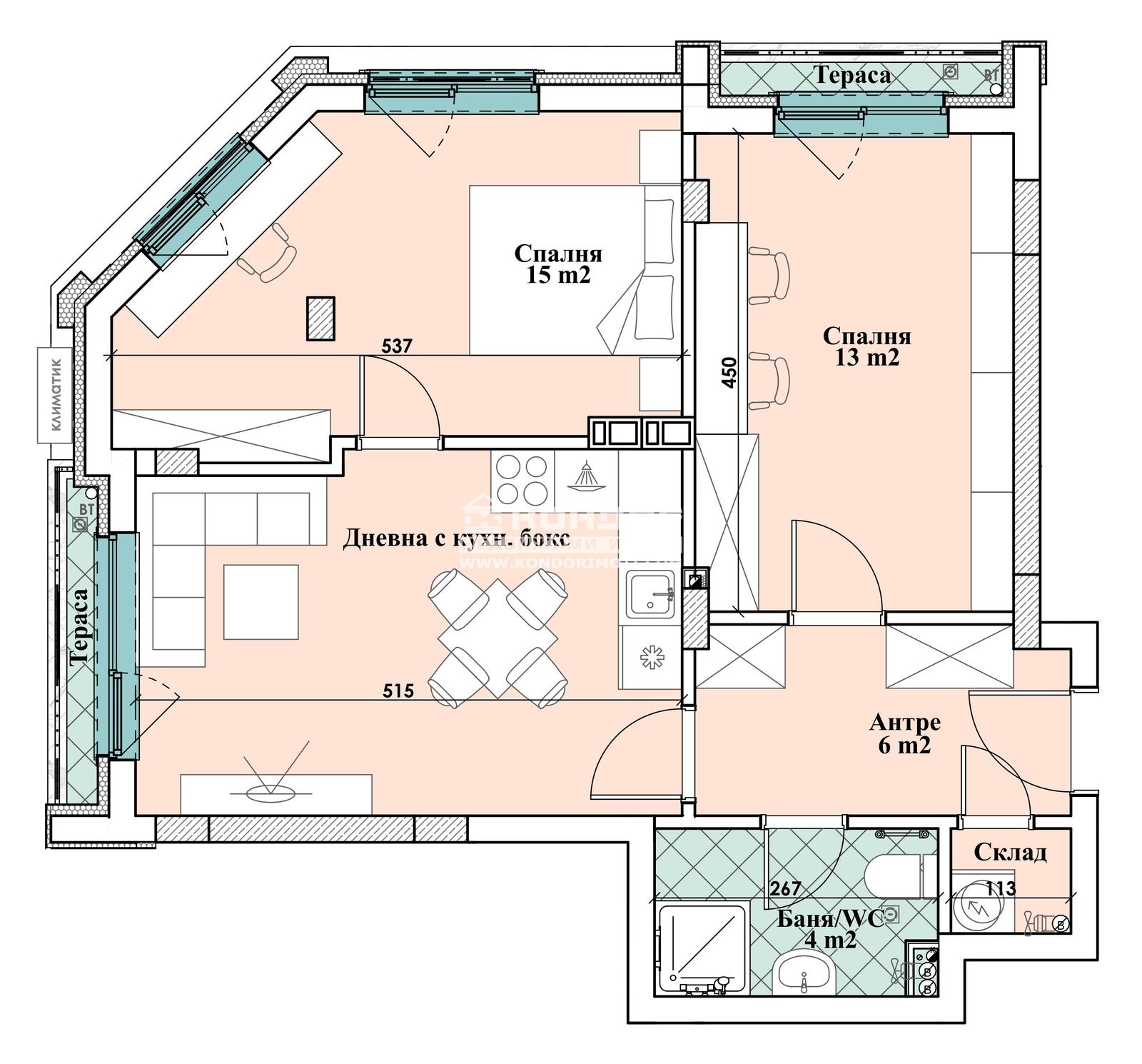 Оферта 59983: СПЕЦИАЛНО ПРЕДЛОЖЕНИЕ- ТОП ЛОКАЦИЯ в сърцето на гр. Пловдив. Представяме Ви проект, вдъхновен от най-добрите имоти на европейския пазар, представляващ възможност за комбинация между удобно разположен дом, качествено строителство и централен район. Новоизградена, модерна и луксозна сграда с малък брой апартаменти и функционално разпределение. Жилището, което ви представяме е тристайно и се състои от дневна с трапезария и кухненски бокс, две спални : 14 и 15 кв.м., баня с тоалетна, склад, широко входно антре и два балкона.