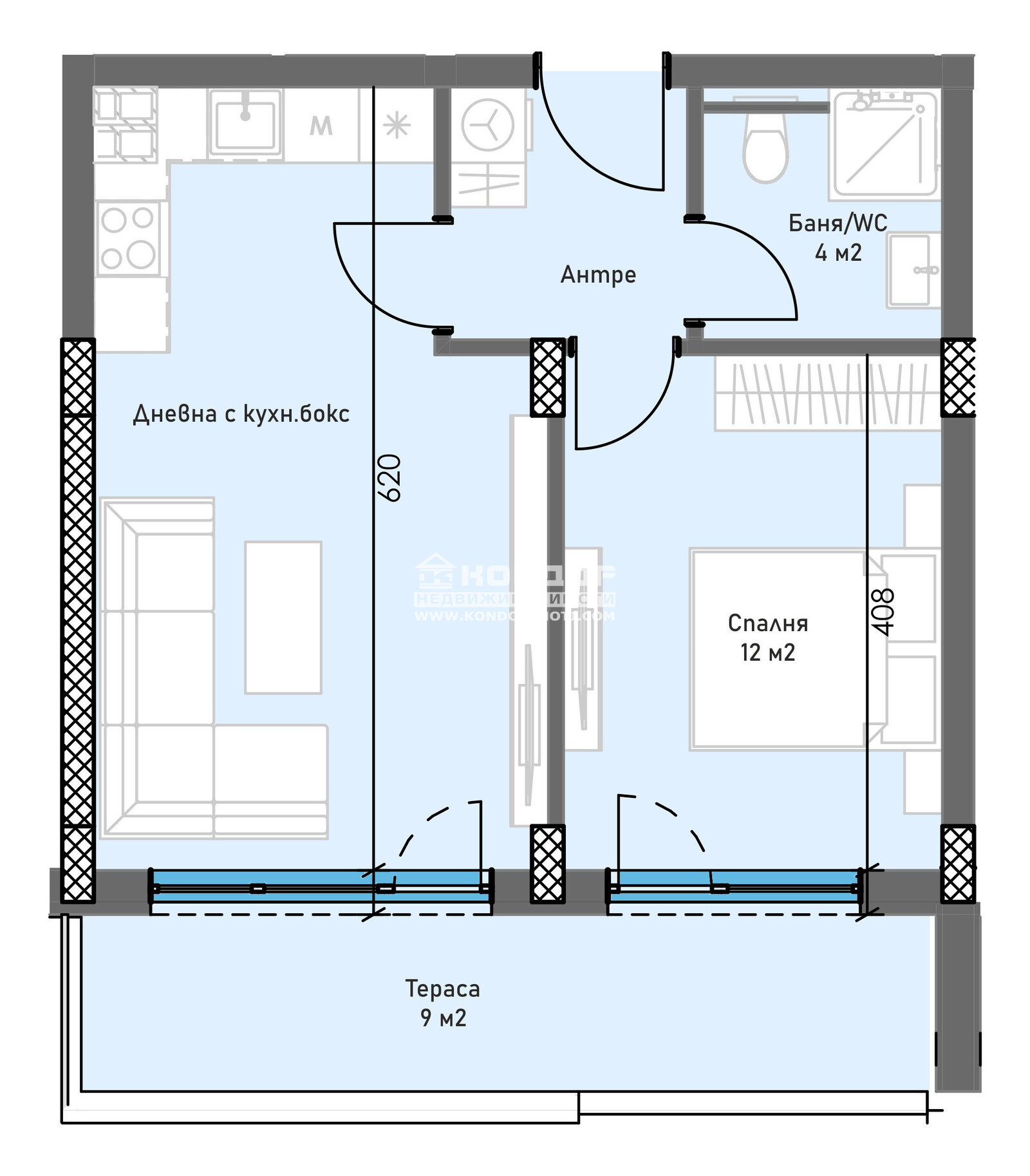 Оферта 64456:Предлагаме Ви възможността да закупите 2 - стаен ИЗЦЯЛО ЮЖЕН апартамент в новоизграждащ се луксозен жилищен комплекс с модерна визия, проектиран да създаде максимален комфорт на живущите в него. Функционално разположени жилищни секции с елегантен силует готов да предложи комфорт и модерен начин на живот. Едно от основните му предимства е страхотната локация, отлична комуникативност и динамична пътна инфраструктура, която осигурява бърз и лесен достъп до комплекса от всяка точка на града. Той съчетава лукс, спокойствие и комфорт с подсигурени паркоместа и гаражи. Жилището се състои от дневна с кухненска част и трапезария, една самостоятелна спалня 12кв.м., баня с тоалетна, входно антре с място за перално и една панорамна тераса обща за двете стаи. Към апартамента има избено помещение, включено в цената! Основната концепция при проектирането е да се постигнат просторни и функционални стаи, с цел да се създаде максимален уют на модерното семейство. Изключителна съвременна архитектура и модерна технология на строителство. Визията е иновативна, привличаща внимание с уникалността си. Всяко жилище ще разполага с пълно окабеляване за домофон, интернет и кабелна телевизия, общите части са луксозно завършени, жилищата са с алуминиева дограма с троен стъклопакет от най-висок клас, масивна блиндирана входна врата. За удобство на живущите съществува възможността да закупят подземни паркоместа и гаражи с топла връзка към комплекса. Гъвкави схеми на разсрочено плащане спрямо възможностите на клиента в рамките на строителството или закупуване чрез Банков Кредит, на изключително изгодни условия за клиенти на агенцията !!! Приложените изображения са от завършени проекти на строителната фирма.