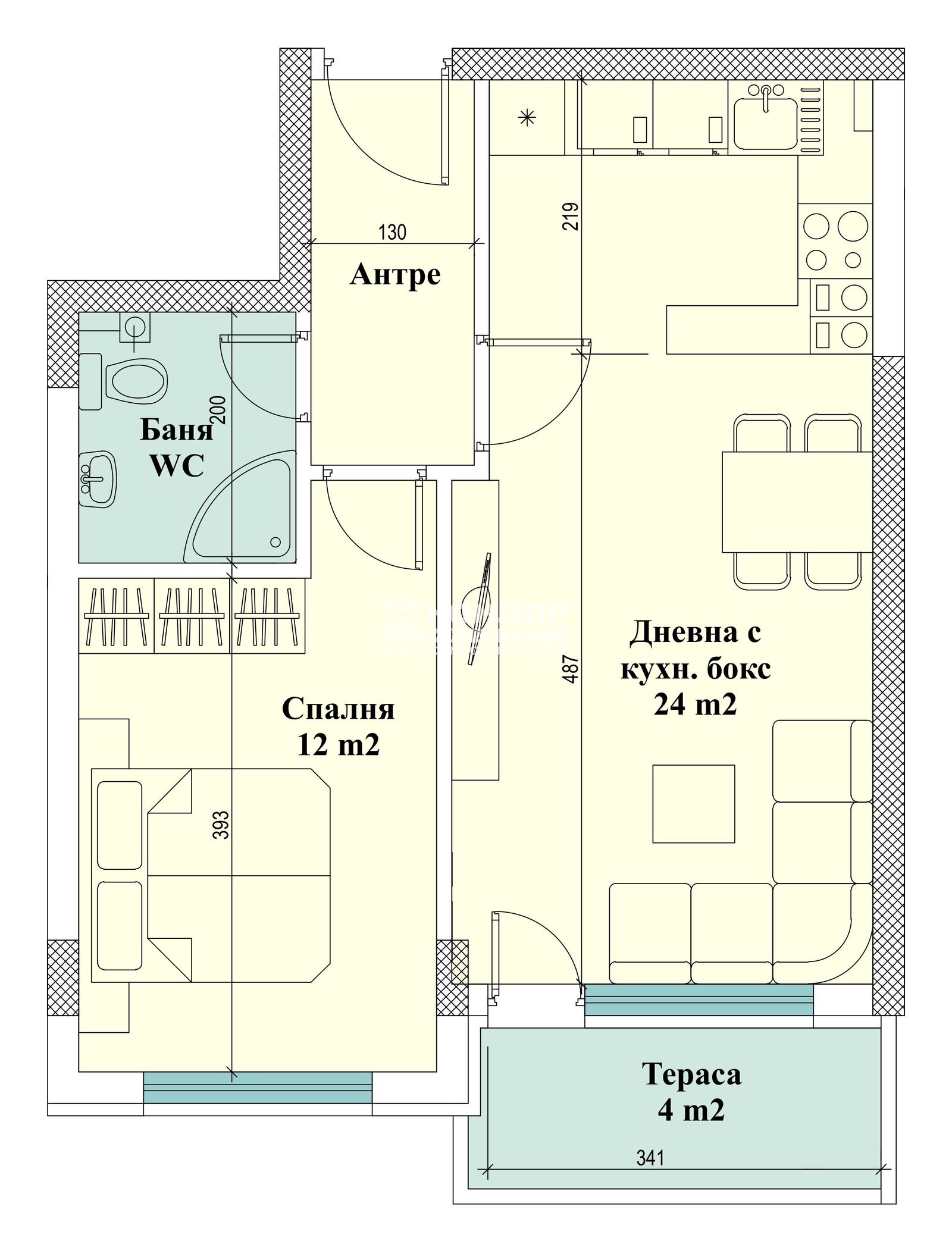 Оферта 62275: Специално предложение - Новоизградена сграда, намираща се в престижен и предпочитан район. Разпределения - Предлагаме на Вашето внимание двустаен апартамент, състоящ се от дневна 24 м2 с трапезария и кухненски бокс с излаз на тераса, непреходна спалня 12 м2, баня с тоалетна и входно антре. Към апартамента има прилежаща изба от 3 м2 включена в цената.