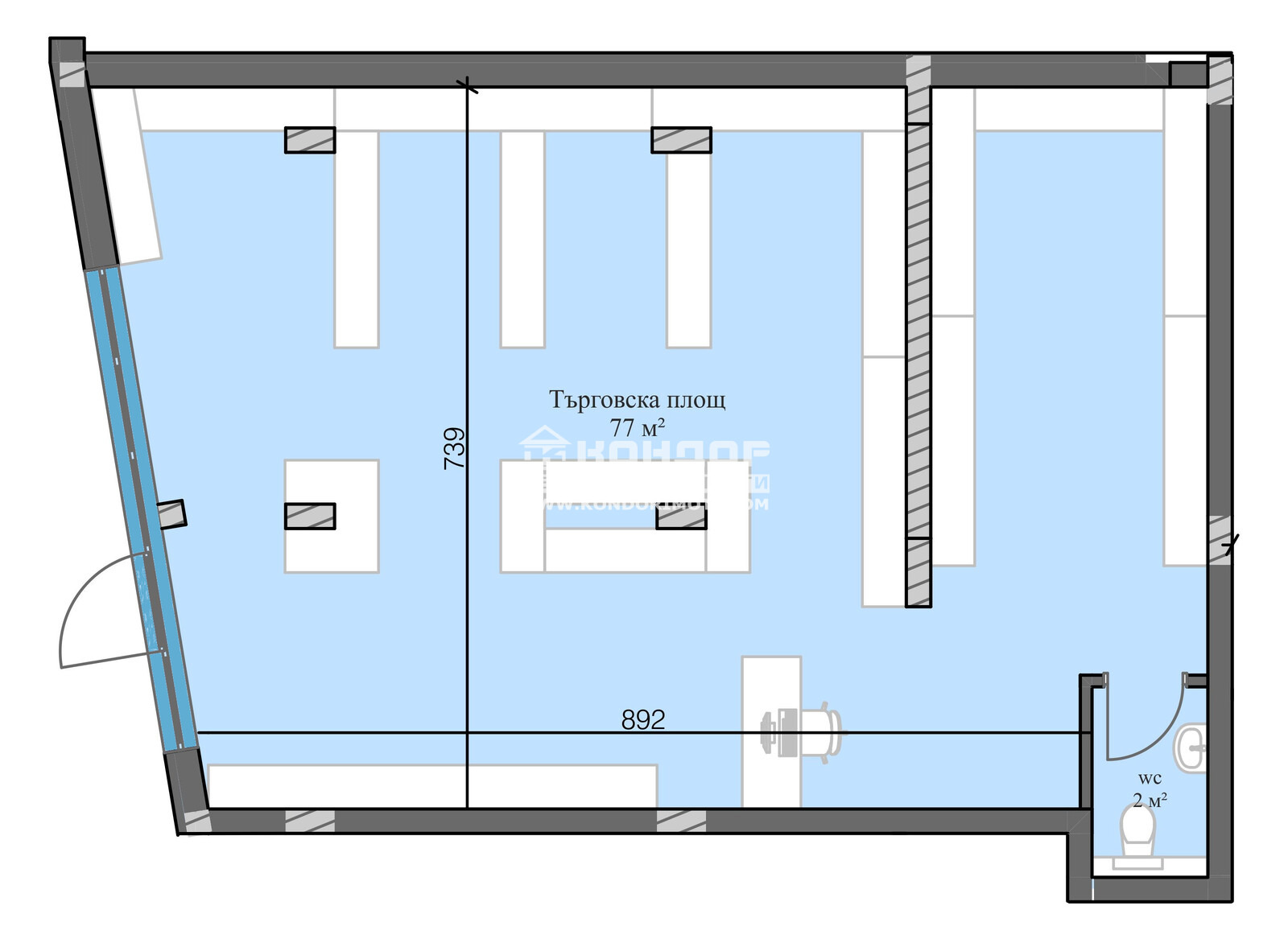 Разпределения - Сграда със смесено ползване, апартаменти, офиси, магазини, заведения. МАГАЗИНЪТ, който ви предлагаме се състои едно основно помещение със светла площ 77 кв.м., и санитарно помещение. ГОЛЯМА ВИТРИНА с лице на оживена улица.