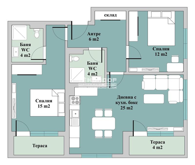 Разпределения - Тристаен апартамент, състоящ се от югозападна дневна с трапезария и кухненски бокс - 25 м2, голяма родителска спалня - 15 м2 с прилежаща баня с тоалетна, детска стая -12 м2, второ санитарно помещение, входно антре с обособен кът за пералня и две тераси.