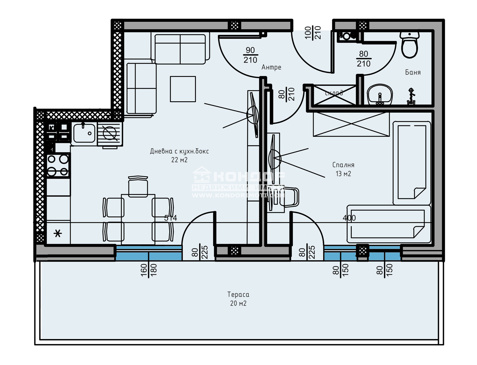 Оферта 63292: Фиксирани Цени - без опция за промяна по време на строителството !!! Сега имате възможността да си закупите функционален 2-стаен апартамент с югоизточно изложение в малка новоизграждаща се луксозна сграда, проектирана така, че да създаде максимален комфорт и уют с изключително нисък процент общи части - 13.00 %. Страхотна Локация в един от най-бързо развиващите се райони с нискоетажно застрояване на тихо и спокойно място в близост до всички необходими комуникации. Жилището се състои от дневна 22кв.м. с трапезария и кухненски бокс, една самостоятелна спалня 13.30кв.м., баня с тоалетна, входно антре със склад и една панорамна тераса 20кв.м., обща и за двете стаи. Обектът се строи от фирма с доказан опит и множество завършени проекти , осъществени с висококачествени материали и съвременни технологии, по европейски стандарти, шесткамерна PVC дограма, червена Австрийска Тухла, масивна Блиндирана входна врата с 4-странно заключване, сензорно осветление, хидравлични асансьори с огледална кабина. Свободни Паркоместа в двора на цени от 8000 евро!!! Възможност за закупуване чрез Банков Кредит или на разсрочено плащане в рамките на строителството !!! ЧУДЕСНА ИНВЕСТИЦИЯ! Възползвайте се от възможността да живеете в малка бутикова сграда. Приложените изображения са от готови сгради на строителната компания!ВИЖТЕ ОЩЕ ИЗГОДНИ ОФЕРТИ НА https://www.kondorimoti.com/ С ЕЖЕДНЕВНА АКТУАЛИЗАЦИЯ!
