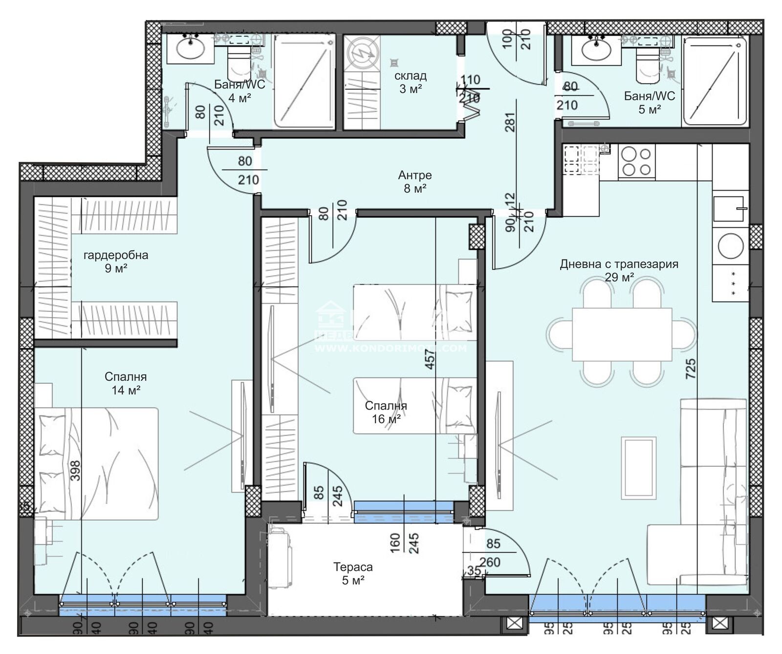 Оферта 62518: Прекрасни просторни жилища за продажба в НОВА СГРАДА в близост до търговски център, големи вериги магазини, паркове и учебни заведения! Новият жилищен комплекс се отличава с простор и открити гледки, контролиран достъп на автомобили и луксозно завършени общи части. Апартаментът, който Ви предлагаме, е просторен тристаен и се състои от светла дневна 29кв.м. с кухненски бокс и трапезария, две самостоятелни спални: родителска 14кв.м. със собствен санитарен възел и голям дрешник - 9кв.м. и детска стая 16кв.м., втора голяма баня с тоалетна 5кв.м., склад/перално, входно антре и една тераса. Жилищата са издадени на степен на завършеност, съобразно всички съвременни изисквания с блиндирана входна врата, под - циментова мазилка, тавани и стени - гипсова мазилка, електрическа инсталация до ключ и контакт, многокамерна PVC дограма, напълно завършени тераси и просторна стълбищна клетка, безшумен хидравличен асансьор. Към всеки апартамент се закупува подземно или надземно паркомясто или гараж. Гъвкава схема на разсрочено плащане с отстъпки при по-висока първоначална вноска. Осигурено банково кредитиране на специални условия за нашите клиенти от водещи банки.ВИЖТЕ ОЩЕ ИЗГОДНИ ОФЕРТИ НА https://www.kondorimoti.com/ С ЕЖЕДНЕВНА АКТУАЛИЗАЦИЯ!