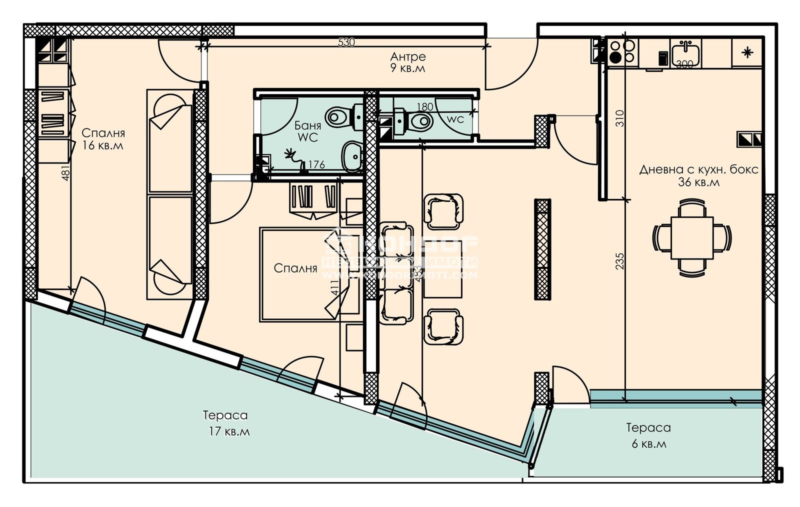 Разпределения - Предлагаме на Вашето внимание просторен тристаен апартамент, състоящ се от функционална дневна - 36кв.м. оформена на кътове: кът за мека мебел, трапезария и кухненски бокс, две самостоятелни спални: родителска - 16кв.м. и детска, баня с тоалетна, втора тоалетна, входно антре и две панорамни тераси.