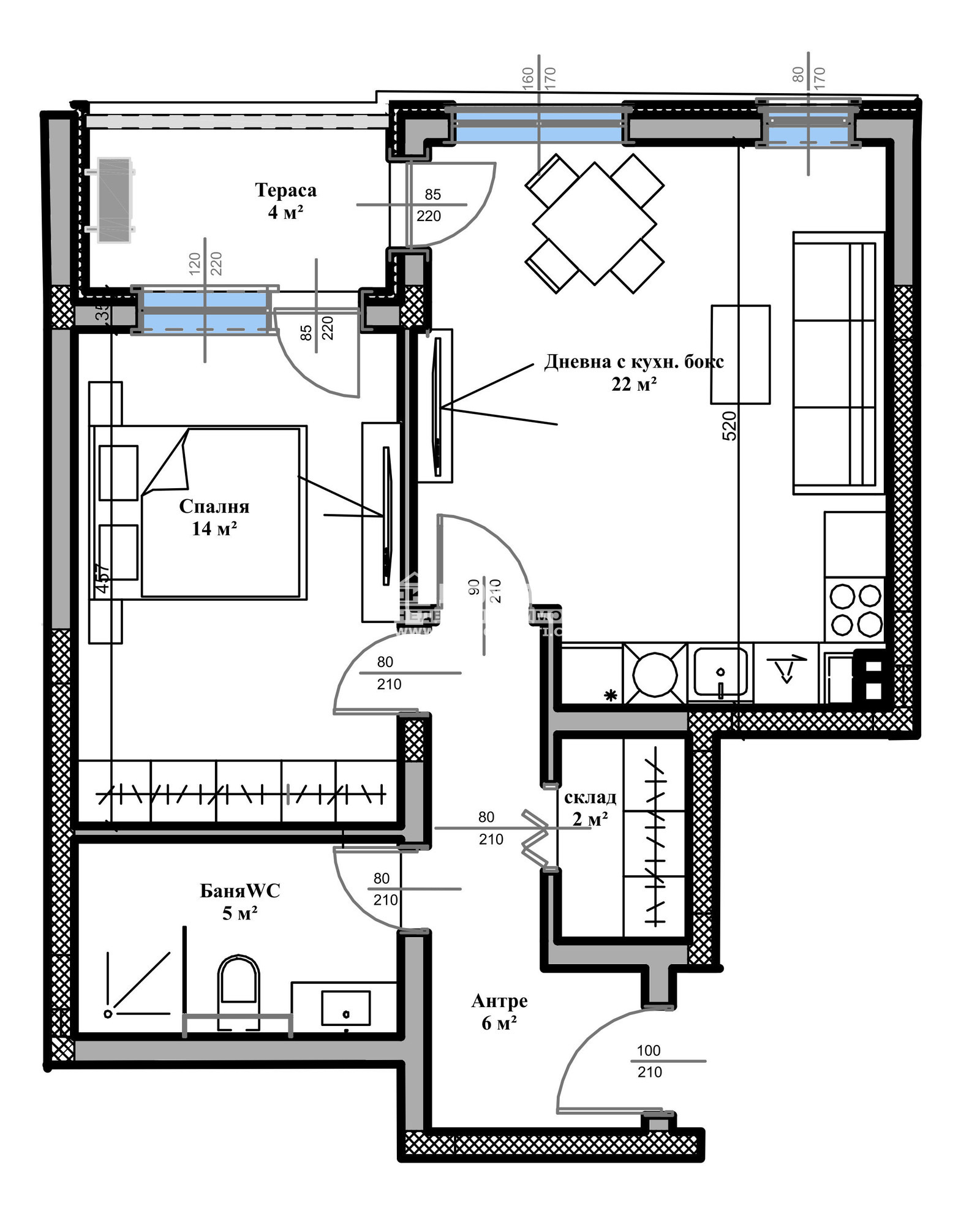 Разпределения - Предлагаме на Вашето внимание светли и функционални апартаменти. Двустаен, състои се от дневна 22кв.м. с трапезария и кухненски бокс с излаз на обща тераса, ПРЕКРАСНА самостоятелна спалня 14кв.м., голяма баня с тоалетна, входно антре и склад. Имате възможността да си закупите жилище с една, две или три спални!