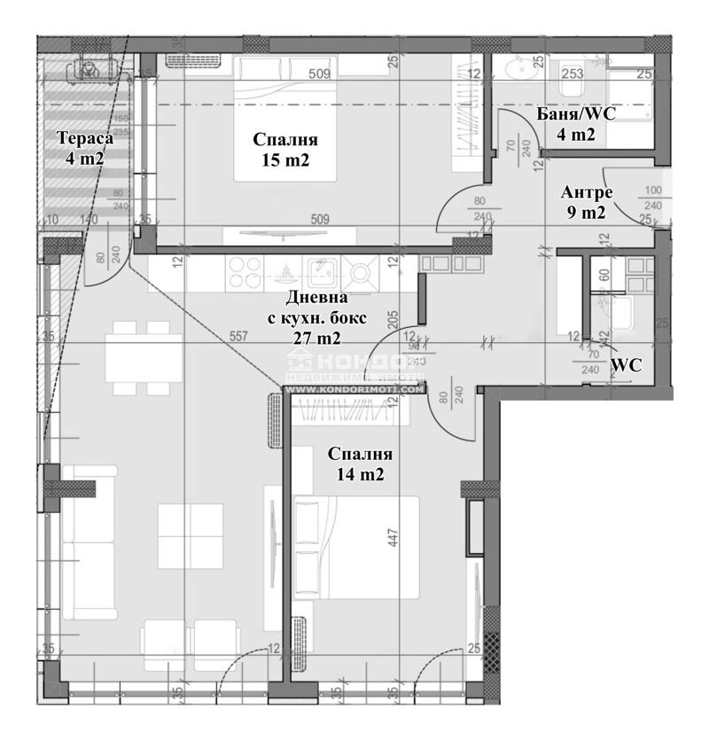 Оферта 56382: Новоизградена луксозна сграда намираща се на чудесно място в близост до Пловдивски панаир съчетаваща в себе си модерната архитектура с високо качество на строителство и усещането за уют и спокойствие. Намира се в най-атрактивния и предпочитан за живеене и инвестиция квартал на Пловдив Кършияка. Жилището е тристайно, състои се от дневна с кухненски бокс 27 кв.м., две непреходни спални по 15 и 14 кв.м, баня с тоалетна, втора тоалетна, входно антре и тераса. Степен на завършеност: стени и тавани- шпакловка, под- циментова замазка, балкони- гранитогрес, мокри помещения-замазка и мазилка, парапети по балкони- стъклени, дограма- PVC с многокамерен профил, врати- външна-блиндирана, хидравличен асансьор, луксозни общи части. Към момента разполагаме с различни свободни по големина жилища с функционални разпределения и избор на етаж. Множество разнообразни услуги в близост -детски градини, училище, супермаркети и удобен транспорт до всяка точка на града. Свободни партерни гаражи и подземни паркоместа. Възможност за разсрочено плащане в рамките на строителството или закупуване чрез Банков Кредит !!!