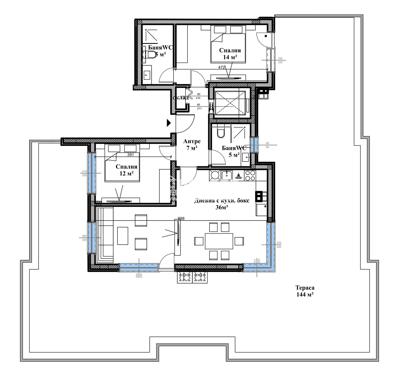 Разпределения - Предлагаме на Вашето внимание светли и функционални апартаменти. Жилището е с три изложения ЮГ/ИЗТОК/ЗАПАД, самостоятелно на етажа с голяма панорамна тераса, състои от ъглова светла дневна 36кв.м. с трапезария и кухненски бокс, две самостоятелни спални: родителска 14кв.м. с голяма собствена баня, детска 12кв.м., втора баня с тоалетна, склад/перално и входно антре с място за гардероб. Към апартамента има асансьор със собствен достъп до него.