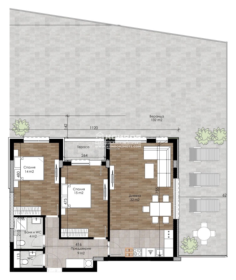 Оферта 59345: АКТ 16!!! Представяме на Вашето внимание комплекс от затворен тип в град Пловдив. Вече 15 години компанията акцентира върху комфорта, безопасността и сигурността в своите комплекси, естетичното оформление на пространството около сградите и отлично развитата инфраструктура, сред която умело да бъдат съчетавани работа, развлечения, спорт и почивка. Апартаментът, които ви предлагаме се състои от Просторна, ъглова дневна - 32 кв.м., две спални 15 и 14 кв.м., баня с тоалетна, втора тоалетна с мивка, входно антре, една тераса и голяма веранда. Най-новият проект на компанията е луксозен комплекс, който е разположен в южната част на град Пловдив, обграден от природа, която дава неподправено усещане за простор и спокойствие, с невероятна гледка към Родопите. Комплексът се базира на концепцията за извънградски комплекс, където в голям терен се разполагат по-малки жилищни единици, къщи и апартаменти, които предлагат спокойствието в покрайнините на града. В сградите има жилища с една и две спални, единични и двойни подземни и надземни гаражи, както и външни паркоместа. На входа на всяка сграда е поставена система за индивидуален чип, високоскоростни асансьори, а вътрешнопарковото пространство е решено в богата висока и ниска растителност, заобиколена от живописни зеленина, детска площадка и площ за спорт. Благодарение на ниската си плътност на застрояване, архитектурния си дизайн и добрата ориентация, комплексът е предпочитано място, което осигурява на обитателите си спокоен и качествен живот. Осигурено Банково Финансиране с изключително Изгодни условия за клиенти на Агенцията от Водещи Банки !!!