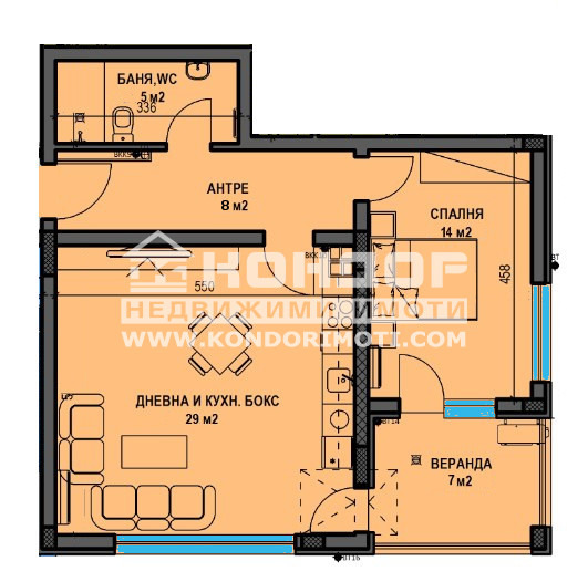 Оферта 61568: Представяме Ви новоизградена малка и луксозна сграда от типа на Фамилна къща, проектирана така, че да създаде максимален комфорт и уют. Сградата се намира на тихо и спокойно място в близост до всички необходими комуникации. Жилището се състои от дневна с трапезария и кухненски бокс 29 кв.м. с излаз на веранда 7 кв.м., една голяма самостоятелна спалня 14 кв.м., баня с тоалетна 5кв.м. и входно антре. Към апартамента се закупува складово помещение на етажа на цена от 1200 евро/бр. Обектът е построен от фирма с доказан опит, като разполагаме с готови сгради и можем да Ви покажем качеството на изпълнение, което се осъществява с висококачествени материали и съвременни технологии, по европейски стандарт, петкамерна PVC дограма, червена Австрийска Тухла, масивна Блиндирана входна врата с 4-странно заключване, сензорно осветление, хидравлични асансьори с огледална кабина. Свободни подземни Гаражи и паркоместа в двора!!! Възможност за Закупуване чрез Банков Кредит!!!Възползвайте се от възможността да живеете в малка бутикова сграда!!!