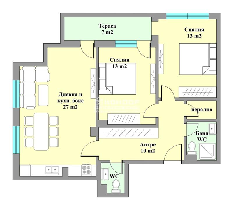Оферта 56532: ИНВЕСТИРАЙТЕ ВЪВ ВАШИЯ КОМФОРТ! Предлагаме ви малка сграда с модернистичен почерк и съвременна визия. Жилището се състои от дневна с трапезария и кухненски бокс 27кв.м. , две самостоятелни спални, баня с тоалетна, втора тоалетна, перално помещение, входно антре и една прекрасна тераса. Сградата е завършена от висококачествени материали и съвременни технологии, които защитават вашия дом от външните влияния. За това се залага на 10см. външна топлоизолация на австрийската фирма BAUMIT, тухли WIENERBERGER създадени от 100% естествени материали, които действат като естествен регулатор на микроклимата. За по-оптимални резултати се залага на на дограма Rehau-EuroDesign 70 с механизъм с двойно отваряне.Общите части са с мрамор и травертин а асансьора е италиански електромеханичен с луксозна кабина с мрамор, италианско дърво и лед панели. Входните врати на апартамента са масивни , блиндирани на Диадорс, ел. инсталацията е изпълнена с материали на ТМТ-Елдом с контакти на Шнайдер,три вида окабеляване за интернет и ТВ- оптичен до всеки апартамент. Изберете достоен лукс и така мечтаната хармония и сигурност.