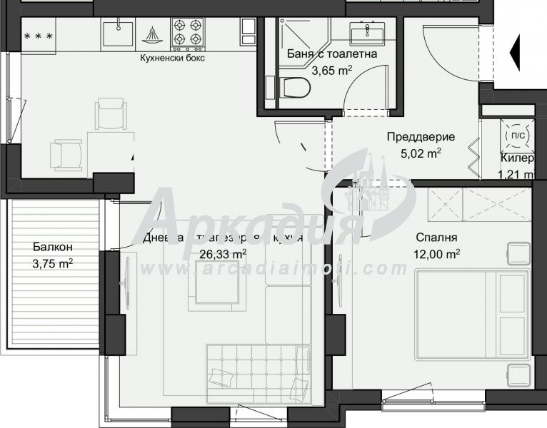 Стаите са функционално разпределени по следния начин - просторна и слънчева дневна с кухненски бокс, спалня, входно антре, баня с тоалетна, килер, тераса.
