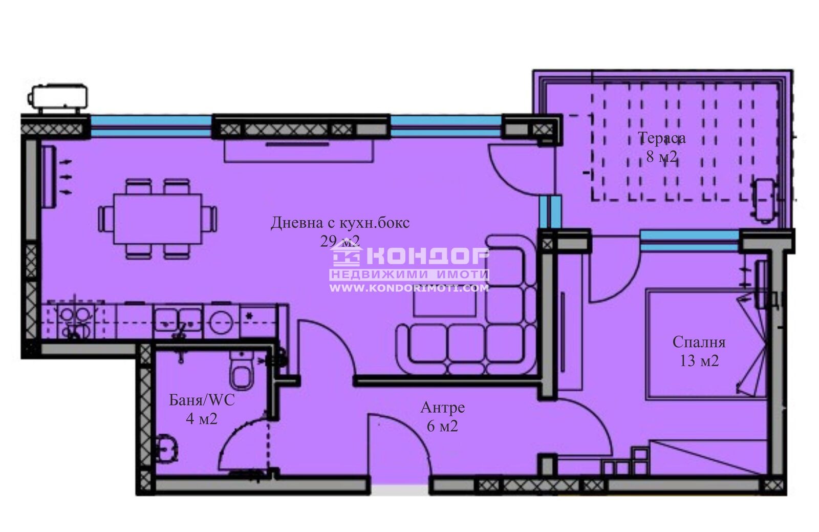 Оферта 63826: Представяме Ви новоизграждаща се малка и луксозна сграда от типа на Фамилна къща, проектирана така, че да създаде максимален комфорт и уют. Сградата се намира на тихо и спокойно място в близост до всички необходими комуникации с отличен и лесен достъп към централната част на града. Жилището се състои от дневна 29кв.м. с трапезария и кухненски бокс с излаз на обща панорамна тераса, самостоятелна спалня 13кв.м., баня с тоалетна и входно антре. Обектът се строи от фирма с доказан опит, като разполагаме с готови сгради и можем да Ви покажем качеството на изпълнение, което се осъществява с висококачествени материали и съвременни технологии, по европейски стандарт, петкамерна PVC дограма, червена Австрийска Тухла, масивна Блиндирана входна врата с 4-странно заключване, сензорно осветление, хидравлични асансьори с огледална кабина. Свободни подземни Гаражи и паркоместа в двора на цени от 8500 евро !!! Възможност за разсрочено плащане в рамките на строителството или закупуване чрез Банков Кредит!!! ЧУДЕСНА ИНВЕСТИЦИЯ предвид качеството на строителство, което може да видите на снимките в Галерия, взети от други готови сгради на строителя. Възползвайте се от възможността да живеете в малка бутикова сграда!!!ВИЖТЕ ОЩЕ ИЗГОДНИ ОФЕРТИ НА https://www.kondorimoti.com/ С ЕЖЕДНЕВНА АКТУАЛИЗАЦИЯ!