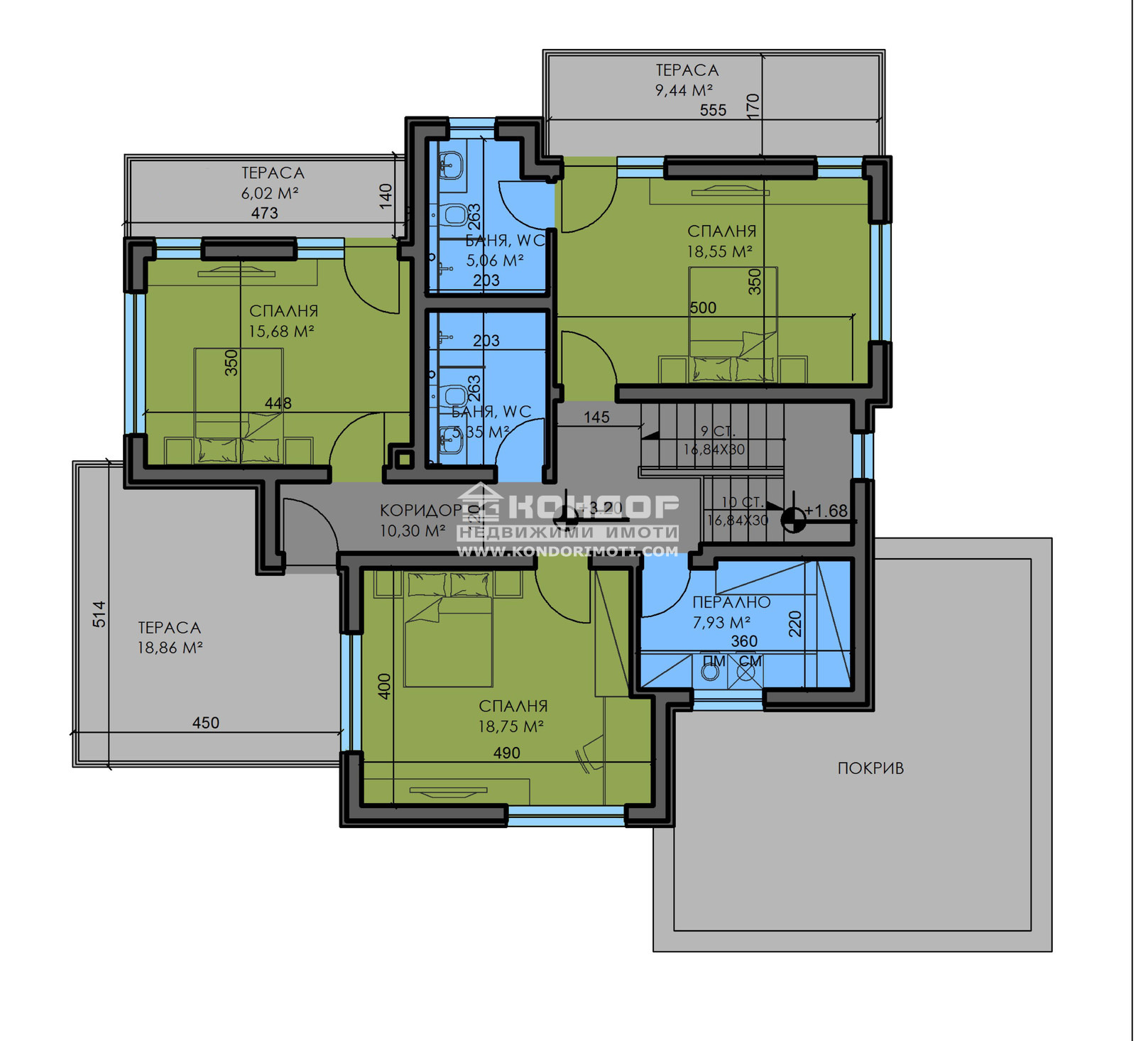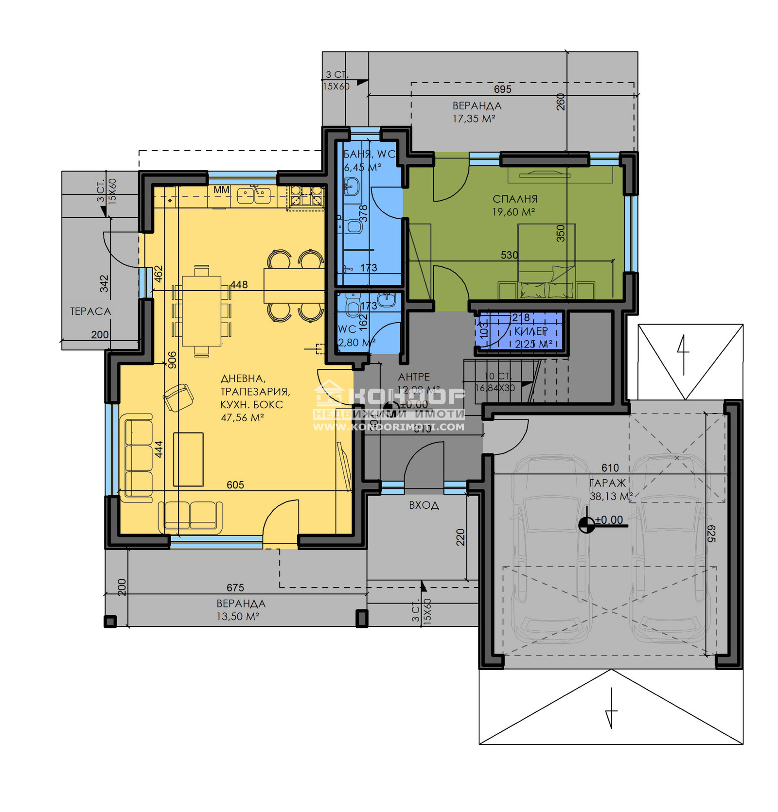 РАЗПРЕДЕЛЕНИЕ: Къщата е Разположена на две нива с общо застроена площ от 265 кв.м. и самостоятелен двор с площ от 509 кв.м., проектирана с модернистична визия и концепция, залагаща на увеличени светли пространства, високи тавани, френски прозорци създаващи усещане за простор и свобода. Къщите са с достъп от асфалтов път, вързани към Вик с права вода и с канализация !!! На първо ниво е разположена просторна и функционална югозападна дневна с площ от 48 кв.м., която ще създаде желания комфорт и уют, оформена на кътове: място за Камина, кът за мека мебел с TV секция, трапезарна част и отделен светъл кухненски бокс с излаз на две покрити веранди, съответно с площ от 17,35 и 13,50кв.м., голяма спалня-19.60кв.м. със собствена баня-6,45кв.м., широко входно антре с място за гардеробна, тоалетна с мивка и килер и двоен гараж с топла връзка. На второ ниво са разположени три спални, като родителската 18.55кв.м. разполага със собствена баня с тоалетна и излаз на тераса, две детски спални-16 и 19кв.м. и втора баня с тоалетна, която обслужва двете детски стаи, перално помещение и две тераси.