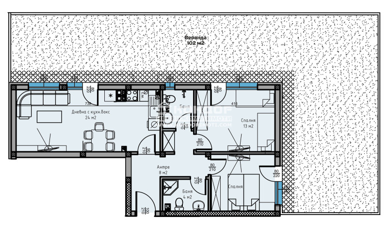 Оферта 63294: Сега имате възможността да си закупите функционален 3-стаен апартамент в малка новоизградена луксозна сграда, проектирана така, че да създаде максимален комфорт и уют с изключително нисък процент общи части - 13.00 %. Страхотна Локация в един от най-бързо развиващите се райони с нискоетажно застрояване на тихо и спокойно място в близост до всички необходими комуникации. Жилището се състои от дневна 24кв.м. с трапезария и кухненски бокс, две самостоятелни спални: детска и родителска, две бани с тоалетна, входно антре със склад, подходящ за гардеробна и една дворна веранда 102кв.м., обща и за трите стаи. Обектът е построен от фирма с доказан опит и множество завършени проекти , осъществени с висококачествени материали и съвременни технологии, по европейски стандарти, шесткамерна PVC дограма, червена Австрийска Тухла, масивна Блиндирана входна врата с 4-странно заключване, сензорно осветление, хидравлични асансьори с огледална кабина. Свободни Паркоместа в двора на цени от 13000 евро!!! Възможност за закупуване чрез Банков Кредит или на разсрочено плащане в рамките на строителството !!! ЧУДЕСНА ИНВЕСТИЦИЯ! Възползвайте се от възможността да живеете в малка бутикова сграда.