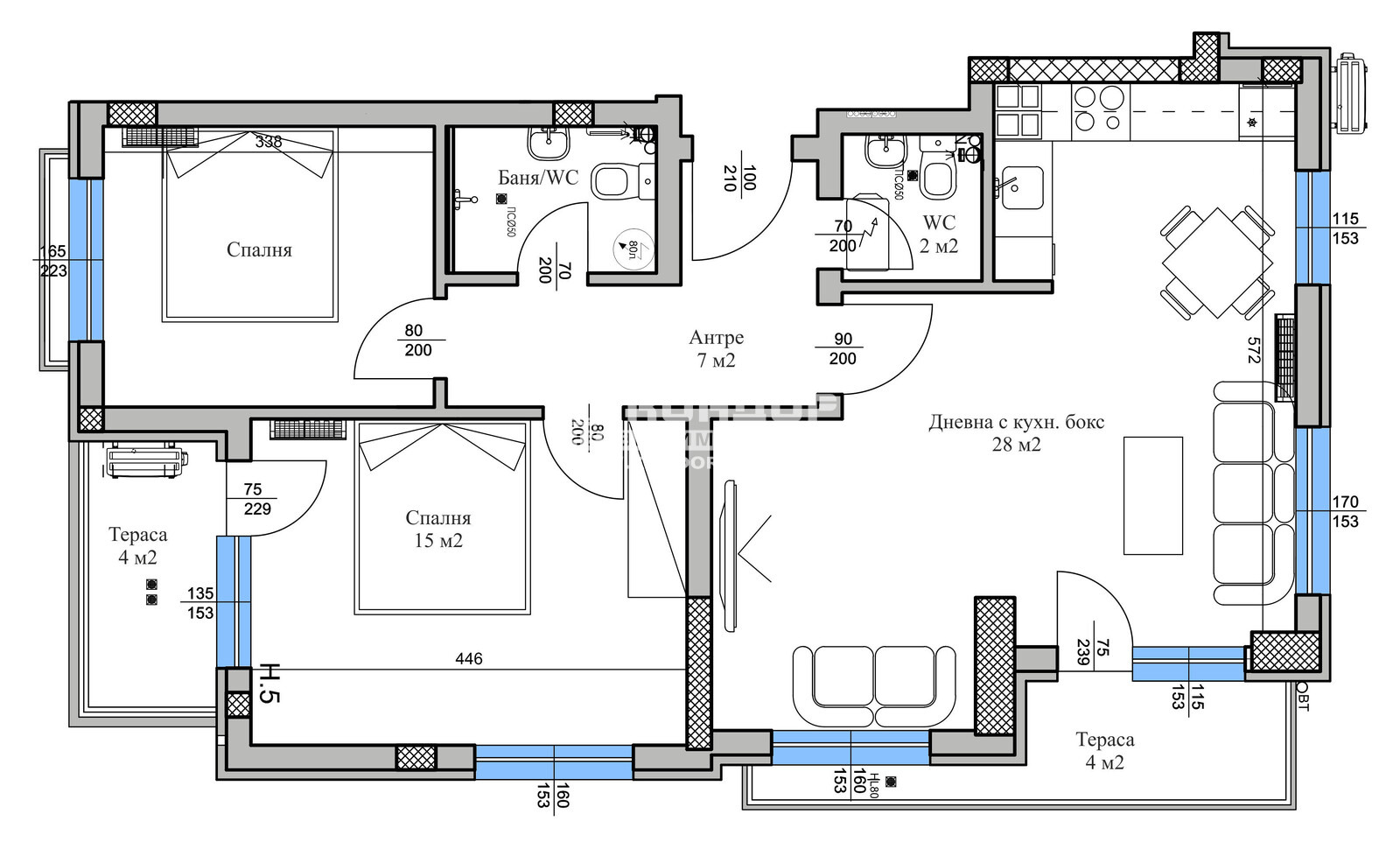 РАЗПРЕДЕЛЕНИЕ: Функционален тристаен апартамент, състои се от ъглова светла дневна- 28 кв.м с големи прозорци и изглед към Гранд хотел Пловдив, просторна родителска спалня 15 кв.м., детска стая, баня с тоалетна, втора тоалетна, широко входно антре и две тераси.