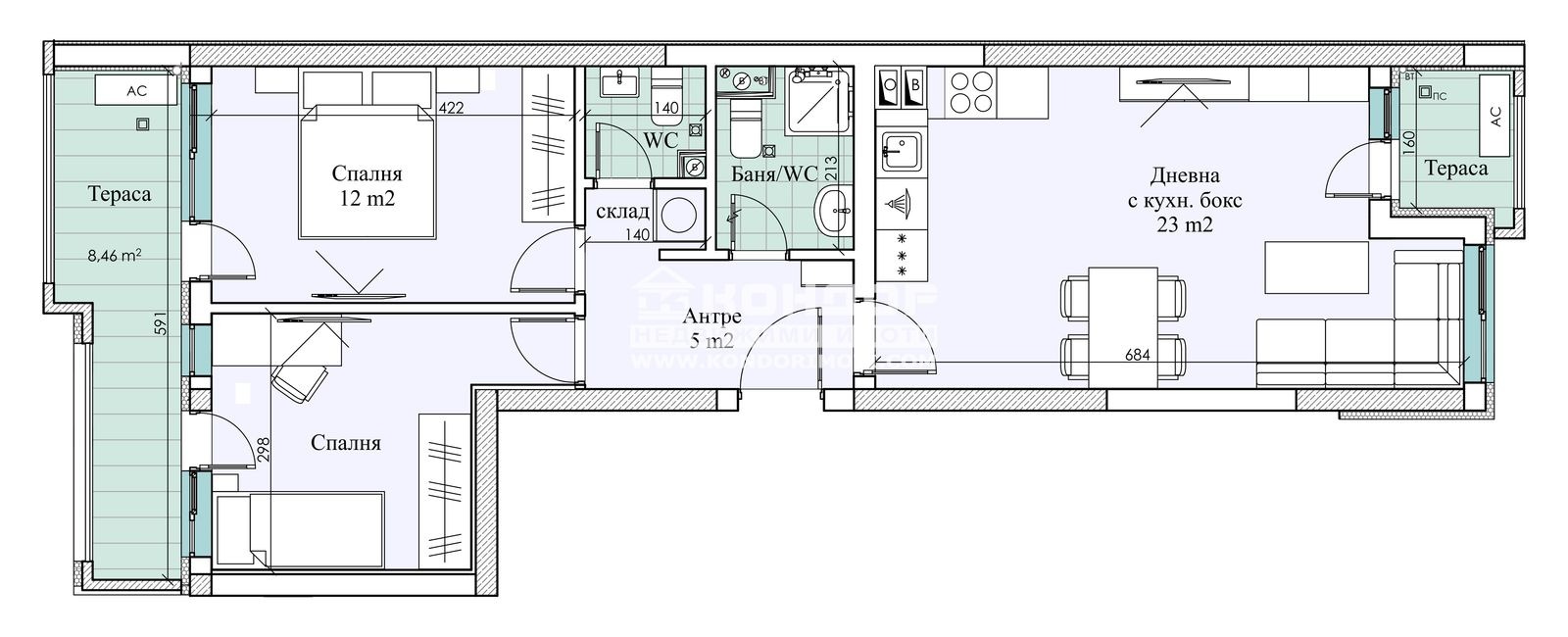 Оферта 57863: Класически стил, качествена среда за живеене и великолепна гледка към Родопите - предоставени в нова сграда цялостната концепция на която е свързана с осигуряване на спокойствие и естетика на живущите. Обектът разполага с едностайни, двустайни и тристайни жилища. Богато озеленен парк е мястото, където всеки един от живущите може да отдъхнете след забързаното ежедневие. Апартаментите са с добре премислени правилни форми на помещенията, което улеснява обзавеждането. Жилището се състои от дневна 23 кв.м с трапезария и кухненски бокс, две самостоятелни спални, баня с тоалетна, второ wc с мивка, склад, антре и две тераси. Сградата е завършена с висококачествени материали и съвременни технологии, които защитават вашия дом от външните влияния. За това се залага на 10см. външна топлоизолация на австрийската фирма BAUMIT, тухли WIENERBERGER създадени от 100% естествени материали ,които действат като естествен регулатор на микроклимата. За по-оптимални резултати се залага на на дограма Rehau-EuroDesign 70 с механизъм с двойно отваряне. Общите части са изпълнени с мрамор и гранитогрес, а асансьорът е италиански електромеханичен с вносен камък, дървесина и лед панели. Входните врати на апартамента са масивни, блиндирани на Диадорс, ел. инсталацията е изпълнена с материали на ТМТ-Елдом с контакти на Шнайдер, три вида окабеляване за интернет и ТВ- оптичен до всеки апартамент. Изберете достоен лукс и така мечтаната хармония и сигурност. Сградата разполага с партерни и подземни Гаражи и Паркоместа.