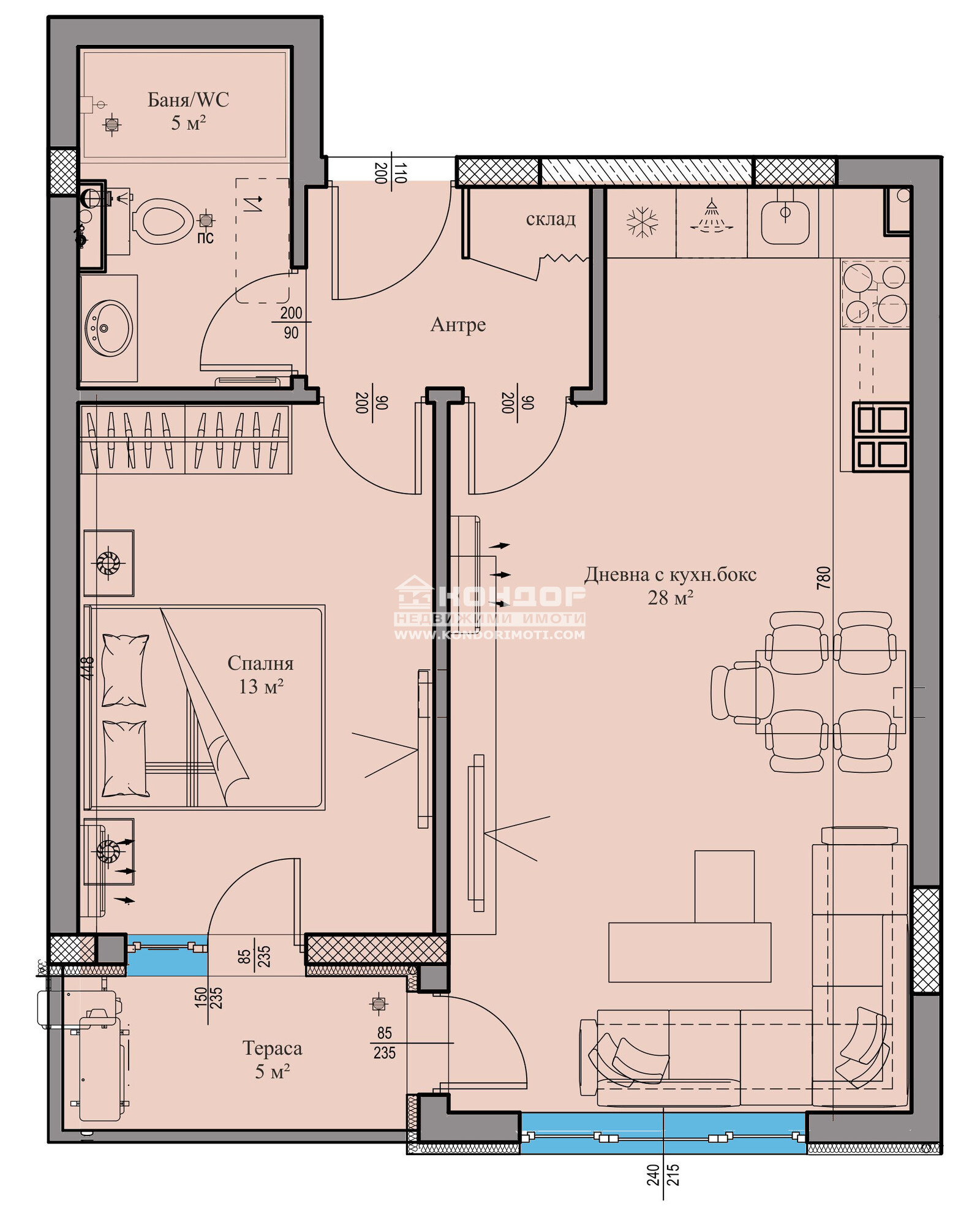 Оферта 63535: Имаме Удоволствието да ви Предложим Функционален Двустаен Апартамент с Югозападно изложение в луксозна сграда, отличаваща се с модерна и съвременна архитектура в един отлично развиващ се район за живеене райони с отлична локация в близост до Училища, детски градини, удобен транспорт към централна градска част и големи хипермаркети. Проектът е с нисък процент общи части, което дава възможност на клиентите да получат повече реална площ !!! Жилището се състои от просторна и слънчева дневна 28кв.м. с трапезария и кухненски бокс, една самостоятелна спалня 13.44кв.м., голяма баня с WC 5кв.м., широко входно антре с място за гардероб и една тераса за двете стаи. Сградата се изпълнява от реномирана Строителна Компания, която разполага с множество готови обекти, утвърдила се като една от водещите и Коректни Фирми в Града. Апартаментите ще бъдат завършени според всички изисквания за съвременно строителство - блиндирана врата, 6-камерна дограма, МДФ-вътрешни врати. Луксозни общи части, хидро и топло изолация, хидравличен асансьор, гранитено стълбище, алуминиев парапет. Свободни Подземни Гаражи и външни Паркоместа . Сградата се намира на Отлично и предпочитано място като локация - ОТЛИЧНА ИНВЕСТИЦИЯ !!! Възможност за изплащане на разсрочено плащане в рамките на строителството.