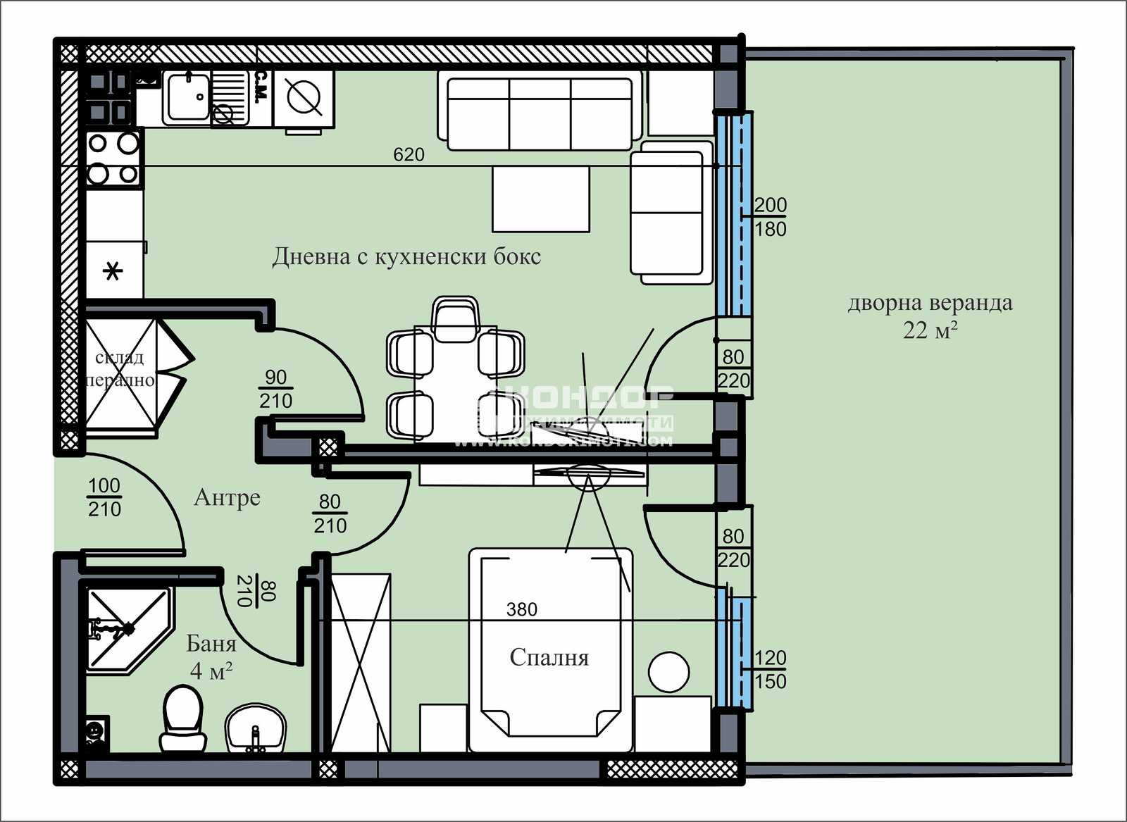 Оферта 60967: БЕЗ КОМИСИОН ОТ КУПУВАЧА!!! Предлагаме Ви възможността да си закупите двустаен апартамент в нискоетажана жилищна сграда намираща се на тихо и спокойно място в близост до всички необходими комуникации, училища, детски градини, удобен транспорт и големи хранителни хипермаркети. Сградата е проектирана проектирана с изключително нисък процент общи части - 10%, което дава повече реална и използваема площ на стаите и създава максимален комфорт на своите ползватели. Жилището се състои от дневна с кухненски бокс, самостоятелна спалня, баня с тоалетна, перално, входно антре и една веранда 22кв.м. обща за двете стаи. Перспективна ИНВЕСТИЦИЯ ЗА ОТДАВАНЕ ПОД НАЕМ!!! Изпълнението се осъществява с висококачествени материали и съвременни технологии, по европейски стандарт, шест камерна PVC дограма, блиндирана входна врата с 4-странно заключване, сензорно осветление, хидравлични асансьори с огледална кабина. Свободни Паркоместа на цени от 8000 евро и партерни Гаражи !!! Приложените снимки са от друга готова сграда на строителната фирма. Възможност за закупуване на разсрочено плащане в рамките на строителството или чрез Банков Кредит на изключително изгодни условия, договорени за клиенти на Агенция КОНДОР !!!ВИЖТЕ ОЩЕ ИЗГОДНИ ОФЕРТИ НА https://www.kondorimoti.com/ С ЕЖЕДНЕВНА АКТУАЛИЗАЦИЯ!