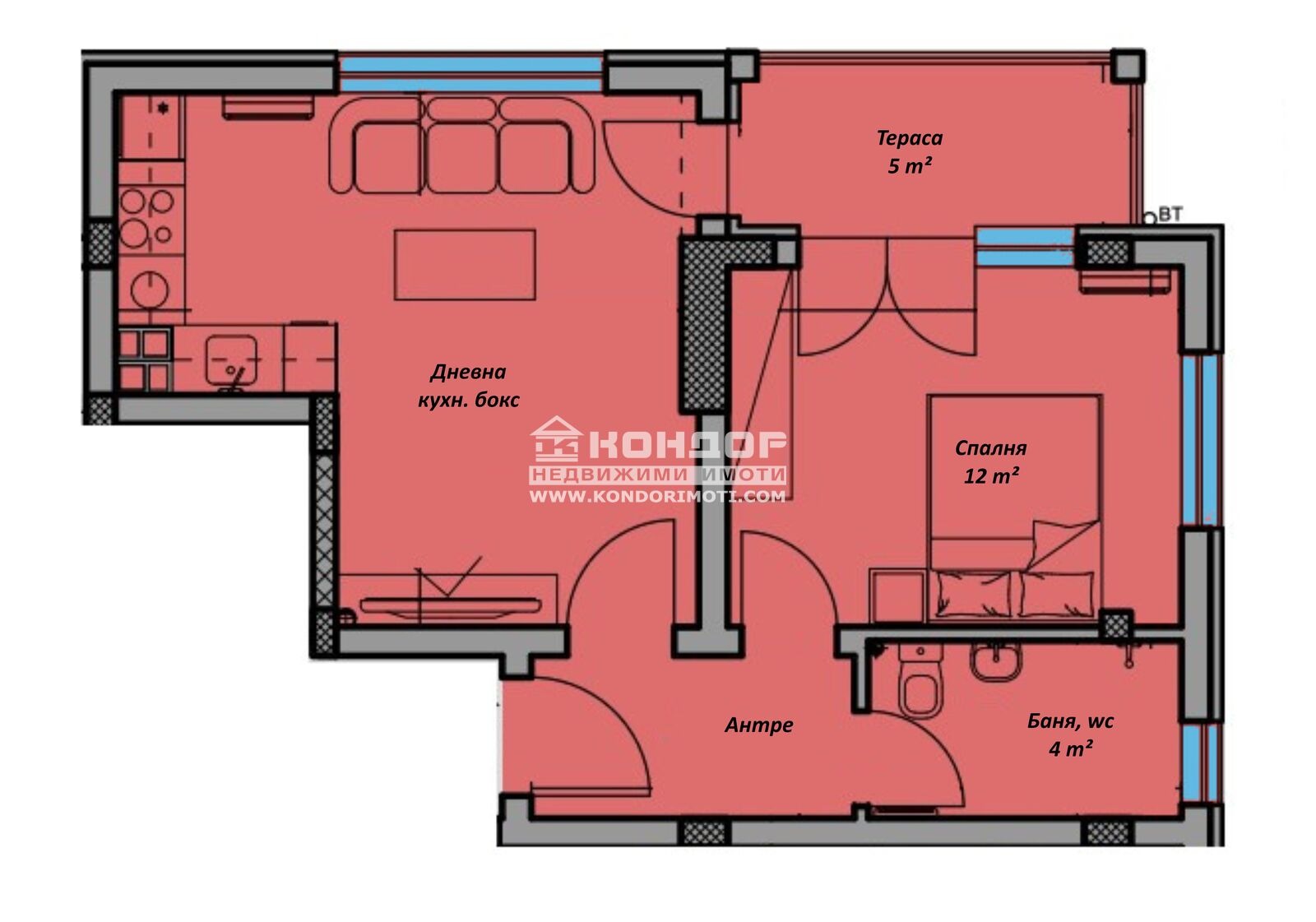 Разпределение: Апартаментът се състои от дневна с кухненски бокс, самостоятелна спалня, баня с тоалетна, входно антре и една тераса обща за двете стаи.