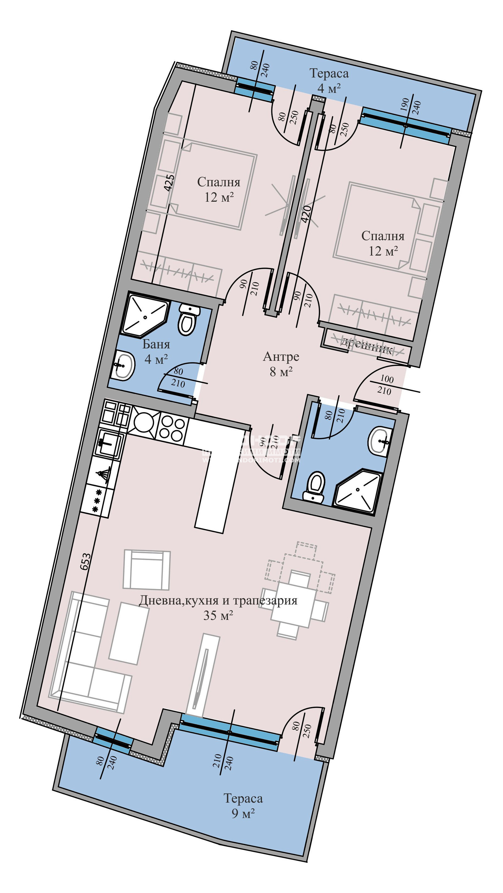 Разпределение: Функционален тристаен апартамент, състои се от просторна светла дневна 35кв.м. оформена на кътове: кът за мека мебел с TV секция, кът за хранене с голяма трапезна маса и кухненска част с барплот, две самостоятелни спални по 12 кв.м. с излаз на обща тераса, две бани с тоалетна, широко антре с място за гардероб и още една хубава тераса към дневната.