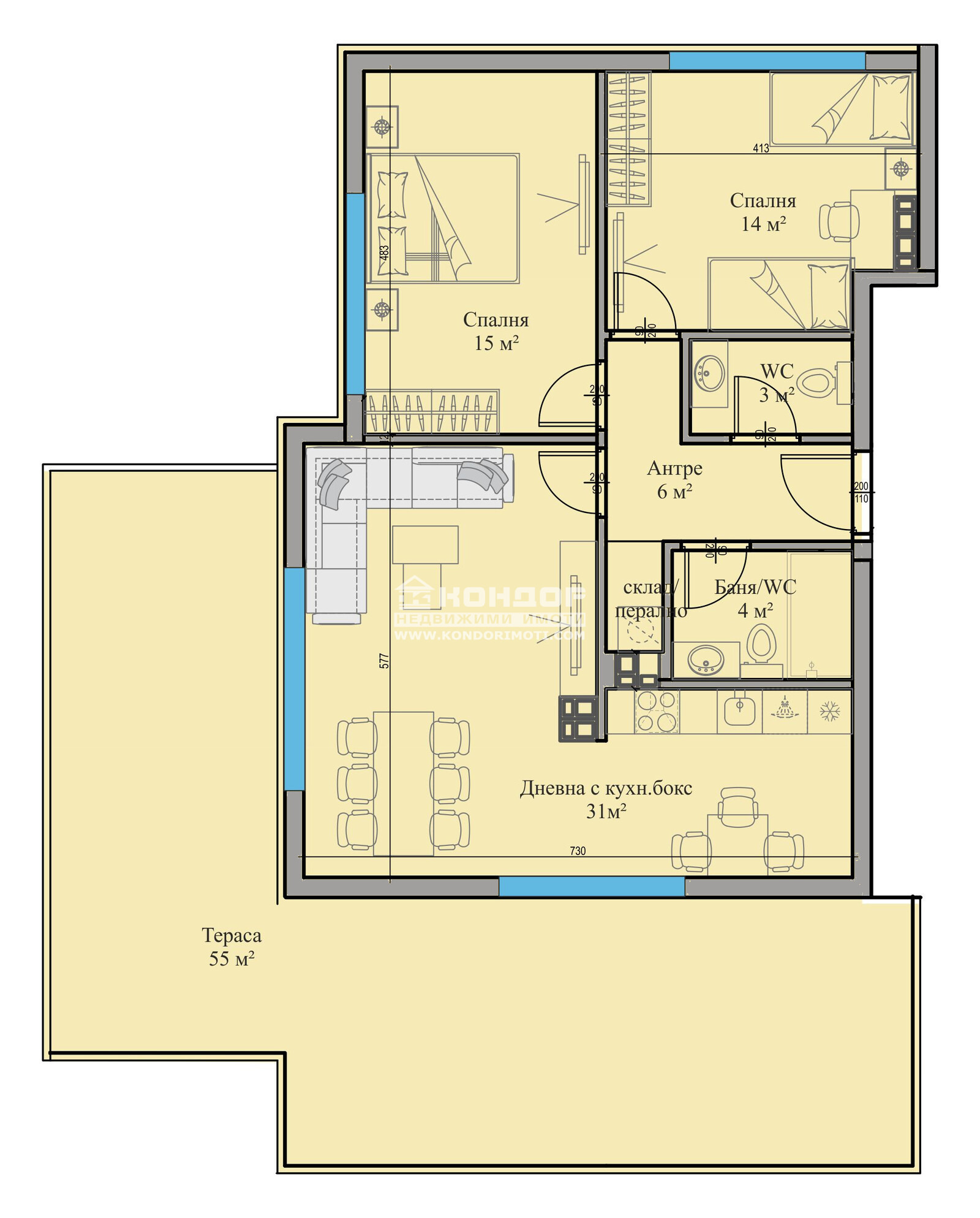 Оферта 63512: Имаме Удоволствието да ви Предложим просторен и функционален Тристаен Апартамент в луксозна сграда, отличаваща се с модерна и съвременна архитектура в един отлично развиващ се район за живеене райони с отлична локация в близост до Училища, детски градини, удобен транспорт към централна градска част и големи хипермаркети. Проектът е с нисък процент общи части, което дава възможност на клиентите да получат повече реална площ !!! Жилището се състои от просторна, ъглова дневна с трапезария и светъл кухненски бокс /31 кв.м./, две големи и непреходни спални: родителска 15кв.м., детска 14кв.м., баня с тоалетна, втора тоалетна с мивка, входно антре, самостоятелен килер с опция за перално помещение и две чудесни панорамни тераси, едната с възможност за изграждане на барбекю и място за отдих и релакс зона. Сградата се изпълнява от реномирана Строителна Компания, която разполага с множество готови обекти, утвърдила се като една от водещите и Коректни Фирми в Града. Апартаментите ще бъдат завършени според всички изисквания за съвременно строителство - блиндирана врата, 6-камерна дограма, МДФ-вътрешни врати. Луксозни общи части, хидро и топло изолация, хидравличен асансьор, гранитено стълбище, алуминиев парапет. Свободни Подземни Гаражи и външни Паркоместа . Сградата се намира на приятно и спокойно място в близост до училища, детска градина и удобен транспорт - ОТЛИЧНА ИНВЕСТИЦИЯ !!! Възможност за изплащане на разсрочено плащане в рамките на строителството !!!