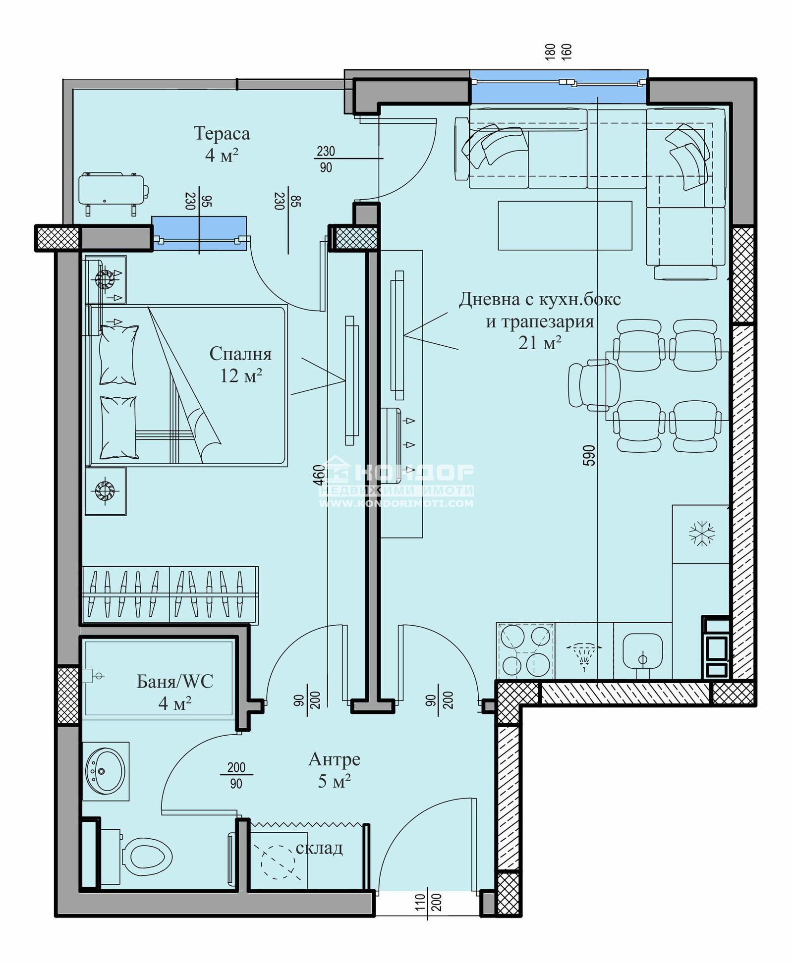 - Разпределение: Двустаен апартамент състоящ се от дневна с кухненски бокс и трапезария, самостоятелна спалня 12кв.м., една тераса, обща за двете стаи, входно антре, перално помещение и баня с тоалетна.