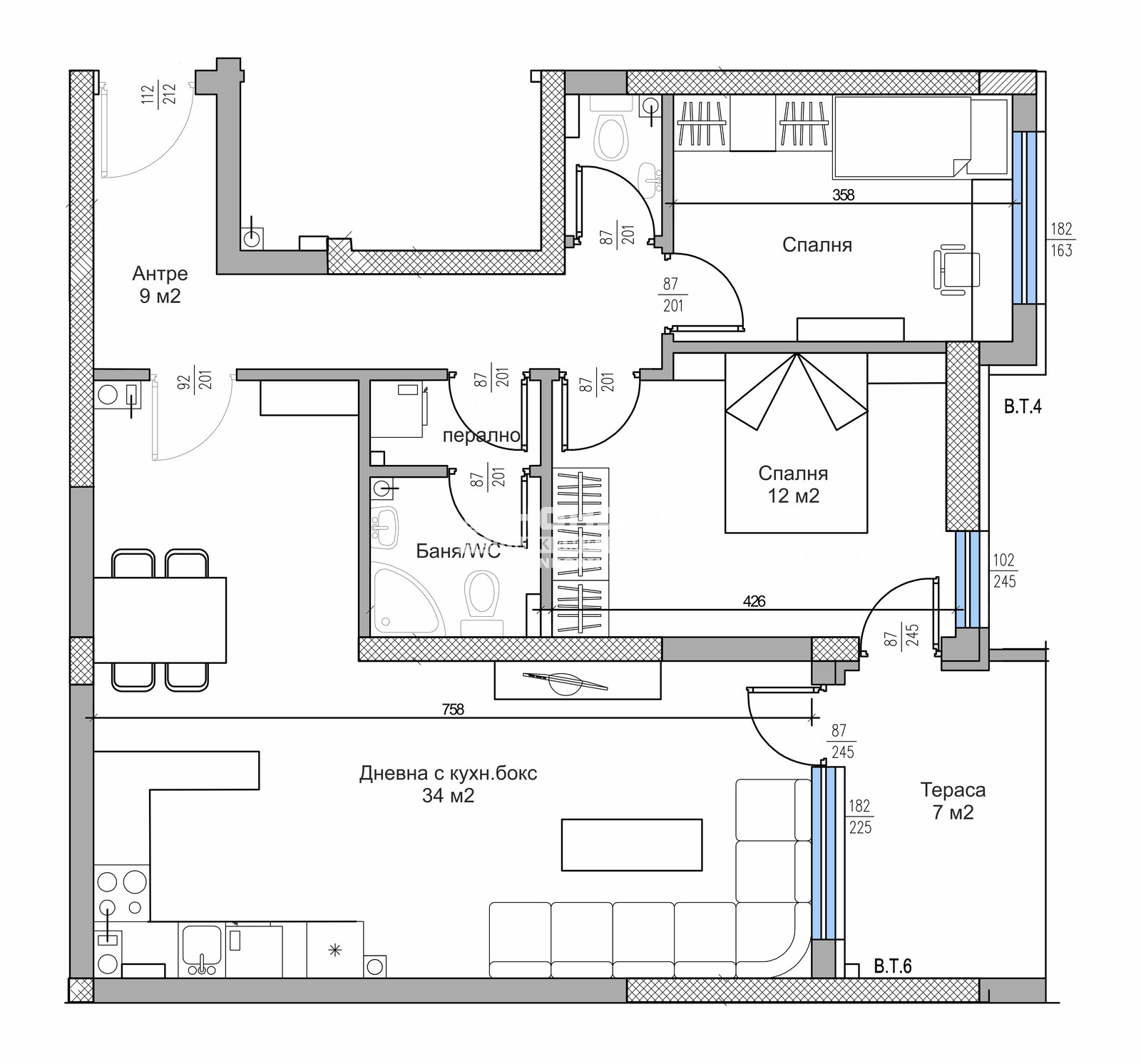Оферта 65886:Специално предложение - Новоизградена сграда, намираща се в престижен и предпочитан район. Разпределения - Предлагаме на Вашето внимание тристаен, състоящ се от просторна дневна 34 м2 с трапезария и кухненски бокс с излаз на тераса, две непреходни спални, баня с тоалетна, втори санитарен възел, перално помещение и входно антре. Към апартамента има прилежаща изба.
