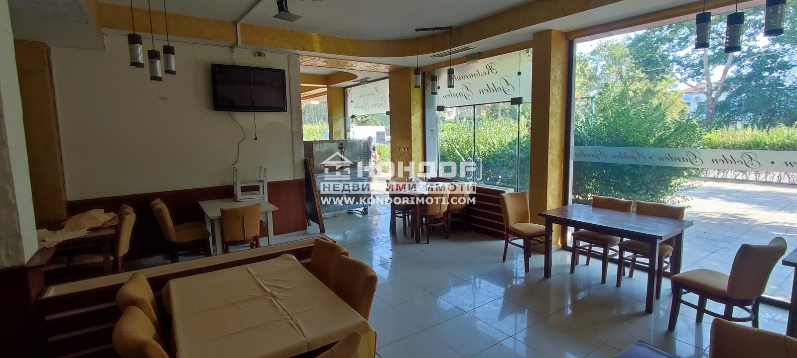 оферта 55400 - ТОП ЛОКАЦИЯ !!! ГЛАВЕН БУЛЕВАРД !!! Предлагаме на вашето внимание търговски обект разполагащ със страхотна локация !!! Обекта е подготвен като заведение - ресторант и се предлага с цялото налично оборудване !!! Хладилници, котлони, прибори, скари, печки, кухненски плотове, компютри, мивки, плотове, чинии и пр. Включено оборудване за търговската зала-Столове, маси, покривки, прибори, чаши, декорация и пр. Обектът представлява: - Лятна градина с капацитет от 100-120 места в зависимост от разположението. В лятната градина е изградена голяма тента, покриваща цялата лятна градина. - Търговска зала с бар, капацитет от 80-100 места, в зависимост от желаното разположение. - Обзаведена кухня с отделен заден вход, която е функционално разделена (топла кухня, студена кухня, миялно помещение, скара, котлони, отделение за заготовки). -Складови помещения, намиращисе в задната част на кухнята. -Стая за почивка за персонала с отделен санитарен възел. Цената е без ДДС.