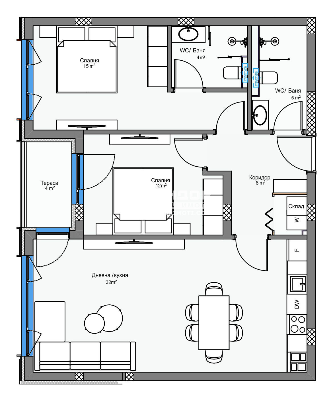 Оферта 64667: Представяме на Вашето внимание един проект на водеща фирма в изграждането на комплекси от затворен тип в град Пловдив. Строителната компанията акцентира върху комфорта, безопасността и сигурността в своите комплекси, естетичното оформление на пространството около сградите и отлично развитата инфраструктура, сред която умело да бъдат съчетавани работа, развлечения, спорт и почивка. Апартаментът, които ви предлагаме се състои от дневна с кухненска част 32кв.м., две самостоятелни спални: детска 12кв.м. и родителска 15кв.м. със собствена баня, втора баня с тоалетна, широко входно антре с място за перално и една тераса. Към апартамента има избено помещение включено в цената. Най-новият проект на компанията е луксозен комплекс, който е разположен в северната част на град Пловдив, обграден от природа, която дава неподправено усещане за простор и спокойствие, с невероятна гледка към Родопите. Комплексът се базира на концепцията за извънградски комплекс, където в голям терен се разполагат по-малки жилищни сгради, които предлагат спокойствието в покрайнините на града. В сградите има жилища с една, две и три спални, единични и двойни подземни и надземни гаражи, както и външни паркоместа. На входа на всяка сграда е поставена система за индивидуален чип, високоскоростни асансьори, а вътрешнопарковото пространство е решено в богата висока и ниска растителност, заобиколена от живописни зеленина, детска площадка и площ за спорт. Благодарение на ниската си плътност на застрояване, архитектурния си дизайн и добрата ориентация, комплексът е предпочитано място, което осигурява на обитателите си спокоен и качествен живот. Осигурено Банково Финансиране с изключително Изгодни условия за клиенти на Агенцията от Водещи Банки !!!