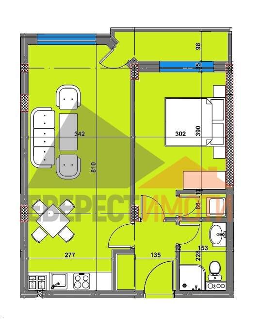 Двустаен апартамент в ЛУКСОР 5! Представлява 3 шестетажни сгради разположени върху двор от 5000кв.м. със старохтни разпределения на жилищата с ИЗКЛЮЧИТЕЛНО МАЛЪК ПРОЦЕНТ ОБЩИ ЧАСТИ. Предлагаме Ви ГОЛЯМ ДВУСТАЕН АПАРТАМЕНТ с възможност за закупуване на ГАРАЖ. СГРАДИТЕ са с красива архитектура на прекрасно място, с визия прилягаща за квартала. Апартамента се състои от просторна дневна с трапезария и кухненски бокс 27кв.м., една хубава спалня 15кв.м., баня с тоалетна, входно антре, склад и чудесна тераса. Строителството е прецизно с много високо качество на изпълнение и материали: керамична тухла, 5-камерна дограма от най-висок клас с мултифункционално стъкло, дизайнерско стълбище/виж галерия/ от естествен камък и облицовка на фасадата, 10 см. външна топлоизолация, парапети на стълбището и терасите, блиндирани входни врати, безшумен асансьор, домофонна система с видеонаблюдение, декоративни елементи по фасадата, LED осветление по общи части и фасада и много други екстри за живущите. Жилищата се издават на шпакловка и замазка с изградена ел. инсталация с контакти и ключове, ВиК на тапа, входна блиндирана врата от най-висок клас. Мястото е тихо и много спокойно, просторно с ниско строителство и чувство за простор. ЧУДЕСЕН за инвестиция и живене. Разсрочено плащане в рамките на строителството. Агенция ЕВЕРЕСТ ИМОТИ съдейства за закупуването чрез банков кредит от водещи банки на преференциални условия за клиентите си!!