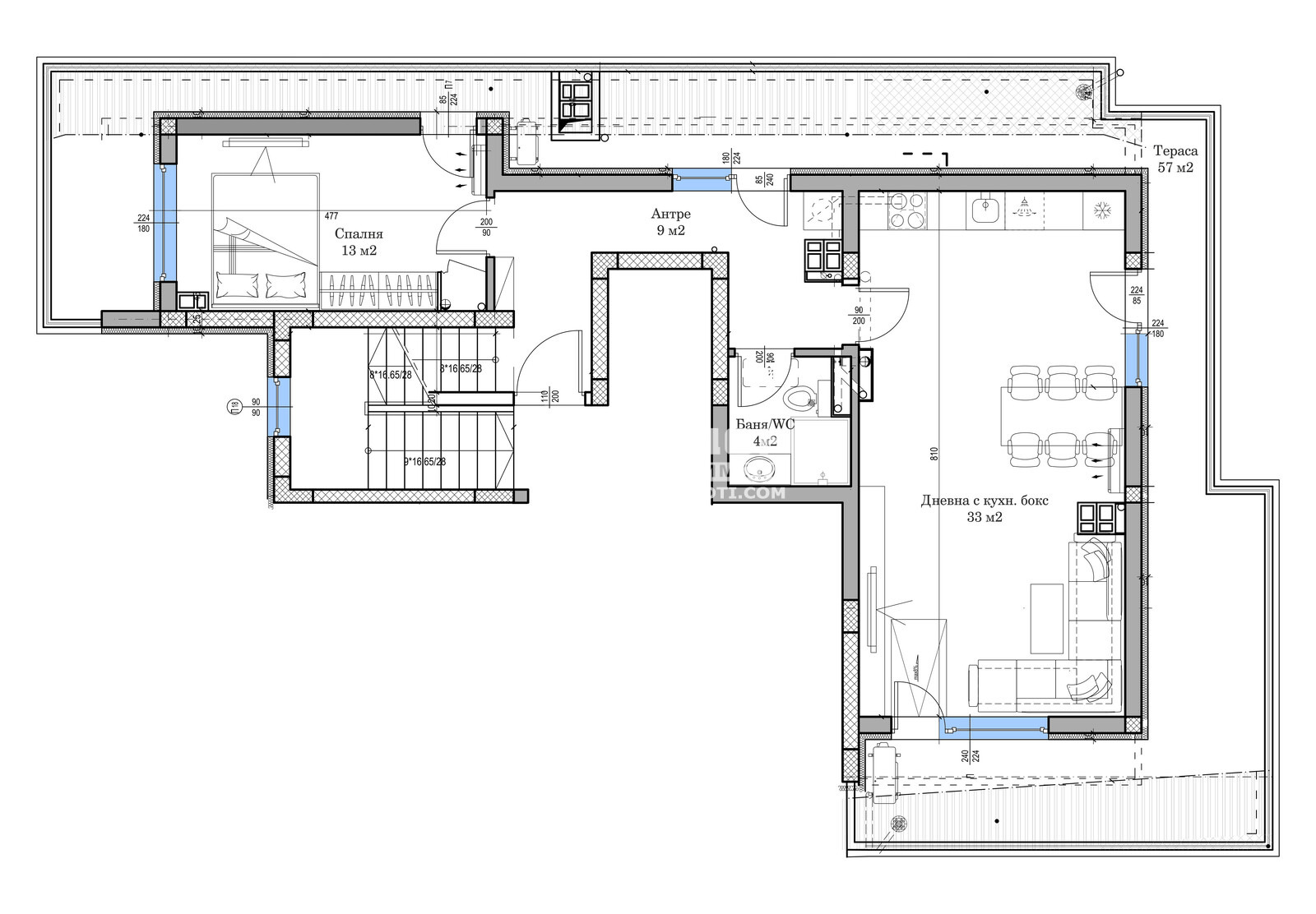 Оферта 65704: Представяме ви новопостроена сграда със собствен стил с изчистена и модерна визия, проектиран така, че да създаде максимален комфорт и уют за живеене. Съчетанието на модерен дизайн и форми с уникално разпределените апартаменти прави обекта изключително привлекателна инвестиция. В сградата има 21 апартамента всеки от тях с функционално разпределение. Проектираните жилища са с квадратури от 57 кв.м до 127 кв.м. Апартамента е тип мезонет на две нива и се състои от: Първо ниво - дневна с кухненски бокс- 33 кв, спални по 13.5 кв, санитарно помещение, коридор и тераса - 57 кв. На второ ниво са разположени две спални, санитарен възел и голяма тераса 69 кв. Отличаващото предимство е площта на жилищата, които са изключително просторни. Изпълнението ще се осъществява с висококачествени материали и съвременни технологии, по европейски стандарт, шесткамерна PVC дограма троен стъклопакет, блиндирана входна врата с 4-странно заключване, сензорно осветление, хидравлични асансьори с огледална кабина, HPL панел !!! Осигурено е паркирането чрез възможност за закупуване на гараж или паркомясто в надземно ниво и подземен паркинг на сградата. Приложените снимки са от готови сгради на строителя.