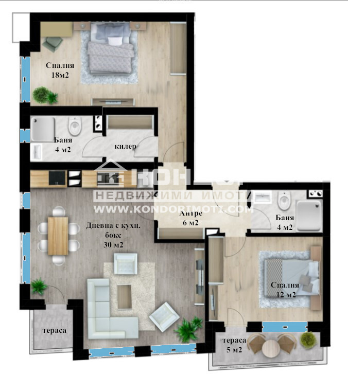 Оферта 62768: СПЕЦИАЛНО ПРЕДЛОЖЕНИЕ- ТОП ЛОКАЦИЯ в сърцето на гр. Пловдив в близост до Бунарджика Представяме Ви проект, вдъхновен от най-добрите имоти на европейския пазар, представляващ възможност за комбинация между удобно разположен дом, качествено строителство и централен район. Нова, модерна и луксозна сграда с малък брой апартаменти и функционално разпределение. Ъглов югозападен хол от 30кв.м. съчетаващ кухненски бокс и трапезария, две самостоятелни спални: родителска 18кв.м. със собствена баня, детска 12кв.м. с излаз на тераса, втора баня с тоалетна, антре и още една тераса към дневната.