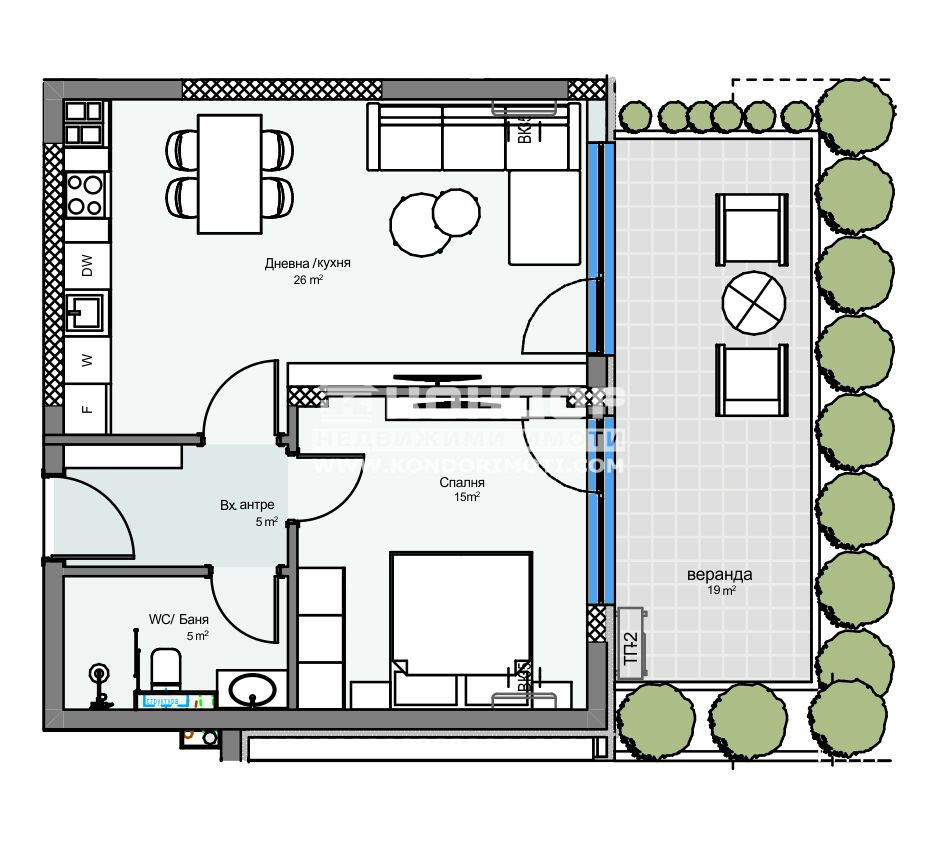Оферта 64679: Представяме на Вашето внимание един проект на водеща фирма в изграждането на комплекси от затворен тип в град Пловдив. Строителната компанията акцентира върху комфорта, безопасността и сигурността в своите комплекси, естетичното оформление на пространството около сградите и отлично развитата инфраструктура, сред която умело да бъдат съчетавани работа, развлечения, спорт и почивка. Апартаментът, които ви предлагаме се състои от просторна дневна 26кв.м. с кухненска част и трапезария, самостоятелна спалня 15кв.м., голяма баня с тоалетна 5кв.м., входно антре и една обща веранда. Най-новият проект на компанията е луксозен комплекс, който е разположен в северната част на град Пловдив, обграден от природа, която дава неподправено усещане за простор и спокойствие, с невероятна гледка към Родопите. Комплексът се базира на концепцията за извънградски комплекс, където в голям терен се разполагат по-малки жилищни сгради, които предлагат спокойствието в покрайнините на града. В сградите има жилища с една, две и три спални, единични и двойни подземни и надземни гаражи, както и външни паркоместа. На входа на всяка сграда е поставена система за индивидуален чип, високоскоростни асансьори, а вътрешнопарковото пространство е решено в богата висока и ниска растителност, заобиколена от живописни зеленина, детска площадка и площ за спорт. Благодарение на ниската си плътност на застрояване, архитектурния си дизайн и добрата ориентация, комплексът е предпочитано място, което осигурява на обитателите си спокоен и качествен живот. Осигурено Банково Финансиране с изключително Изгодни условия за клиенти на Агенцията от Водещи Банки !!! Приложените изображения са от готови сгради на строителната компания!ВИЖТЕ ОЩЕ ИЗГОДНИ ОФЕРТИ НА https://www.kondorimoti.com/ С ЕЖЕДНЕВНА АКТУАЛИЗАЦИЯ!