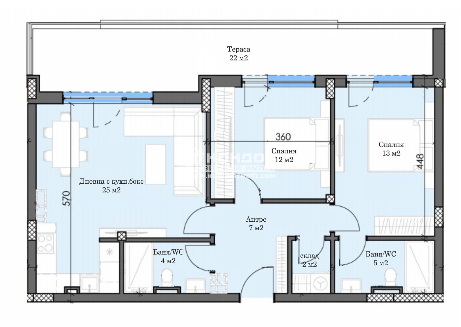 Оферта 65930:Предлагаме Ви възможността да закупите тристаен апартамент в новоизграждащ се луксозен жилищен комплекс с модерна визия, проектиран да създаде максимален комфорт на живущите в него. Функционално разположени жилищни секции с елегантен силует готов да предложи комфорт и модерен начин на живот. Едно от основните му предимства е страхотната локация, отлична комуникативност и динамична пътна инфраструктура, която осигурява бърз и лесен достъп до комплекса от всяка точка на града. Той съчетава лукс, спокойствие и комфорт с подсигурени паркоместа и гаражи. Жилището се състои от дневна /25 кв.м./ с кухненска част и трапезария, две самостоятелни спални: детска 12кв.м. и родителска 13 кв.м. със собствена баня, втора баня с тоалетна, склад, входно антре с място за гардероб и една панорамна тераса. Към апартамента има избено помещение, включено в цената! Основната концепция при проектирането е да се постигнат просторни и функционални стаи, с цел да се създаде максимален уют на модерното семейство. Изключителна съвременна архитектура и модерна технология на строителство. Визията е иновативна, привличаща внимание с уникалността си. Всяко жилище ще разполага с пълно окабеляване за домофон, интернет и кабелна телевизия, общите части са луксозно завършени, жилищата са с алуминиева дограма с троен стъклопакет от най-висок клас, масивна блиндирана входна врата. За удобство на живущите съществува възможността да закупят подземни паркоместа и гаражи с топла връзка към комплекса. Гъвкави схеми на разсрочено плащане спрямо възможностите на клиента в рамките на строителството или закупуване чрез Банков Кредит, на изключително изгодни условия за клиенти на агенцията !!!