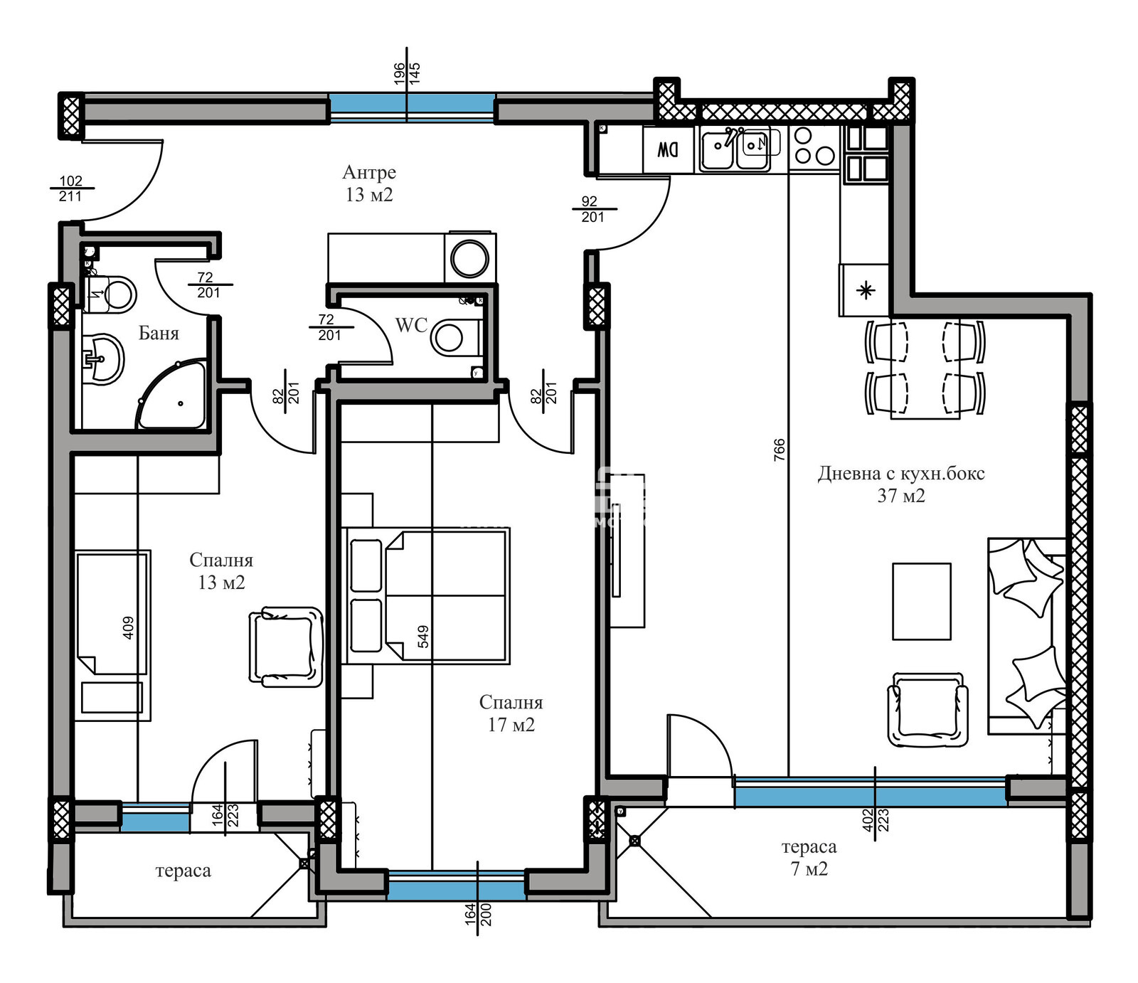Оферта 63742: СТРАХОТНО ПРЕДЛОЖЕНИЕ ЦЕНТРАЛНА ГРАДСКА ЧАСТ !!! Луксозна новоизградена сграда в един от най-предпочитания район на града. Предлагаме ви тристайно жилище със следното разпределение: дневна 37кв.м.+ кухненска част и трапезария с излаз на тераса, две големи спални, съответно с площ от 13 и 17кв.м., баня с тоалетна, втора тоалетна, светло входно антре и още една тераса. Проекта предлага висок клас жилища с функционално разпределение и стил. Високите прозорци осигуряват изобилие от естествена светлина в отлично разпределеното жилищно пространство.