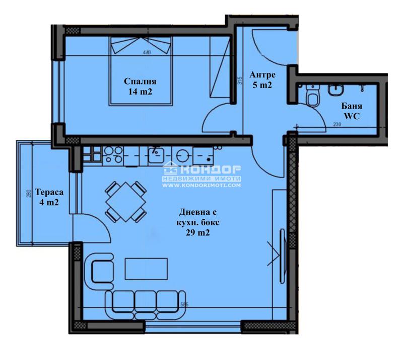 Оферта 58481: Сега имате възможността да си закупите функционален 2-стаен апартамент в малка и луксозна сграда, проектирана така, че да създаде максимален комфорт и уют със сравнително нисък процент общи части - 14.5%. Сградата се намира в един от най-бързо развиващите се райони с нискоетажно застрояване на тихо и спокойно място в близост до всички необходими комуникации. Жилището е с изложение ЮГ/ЗАПАД и се състои от дневна с трапезария и кухненски бокс 29 кв.м., голяма непреходна спалня 14 кв.м., баня с тоалетна, входно антре и една тераса. Обектът се строи от фирма с доказан опит и луксозно изпълнение на своите сгради, което се осъществява с висококачествени материали и съвременни технологии, по европейски стандарти, шесткамерна PVC дограма с троен стъклопакет, червена Австрийска Тухла, масивна Блиндирана входна врата с 4-странно заключване, сензорно осветление, хидравлични асансьори с огледална кабина. Свободни Подземни Гаражи и паркоместа в двора!!! Възможност за закупуване чрез Банков Кредит!!! ЧУДЕСНА ИНВЕСТИЦИЯ предвид качеството на строителство, което може да видите на снимките в Галерия от други готови сгради на същата строителна компания. Възползвайте се от възможността да живеете в малка бутикова сграда!!!