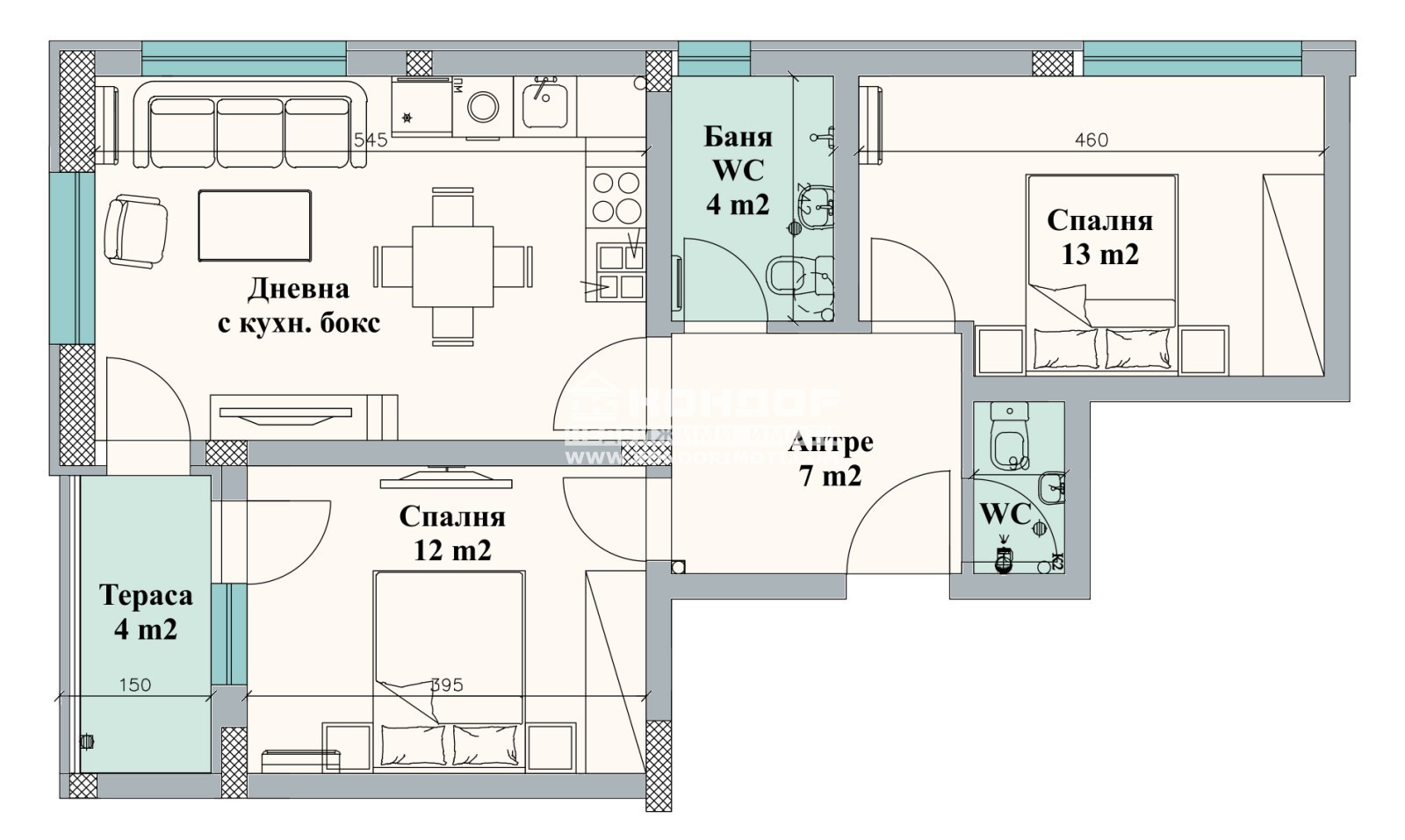 Оферта 60691: Специално предложение - директно от Строител - Без Комисион !!! НОВА СГРАДА !!! Предлагаме на Вашето внимание функционален тристаен апартамент, състоящ се от ъглова югозападна дневна с трапезария и кухненски бокс, две самостоятелни спални 12 и 13 кв.м., баня с тоалетна с прозорец, втора тоалетна, килер, входно антре и една тераса. Жилищната сграда се изгражда в унисон с най-високите европейски стандарти за качество. Използваните материали са съобразени с най-новите тенденции в строителството - модерна външна облицовка, покривна и фасадна изолация, PVC пет камерна дограма, луксозни общи части и други, допринасят допълнително за усещането за лукс и комфорт на обитателите. За удобството на своите собственици, сградата разполага с подземен паркинг с Гаражи и Паркоместа. Начин на плащане - Кондор имоти предлага възможност за банково финансиране от водещи банки на преференциални условия или договорено Разсрочено плащане в рамките на строителството.