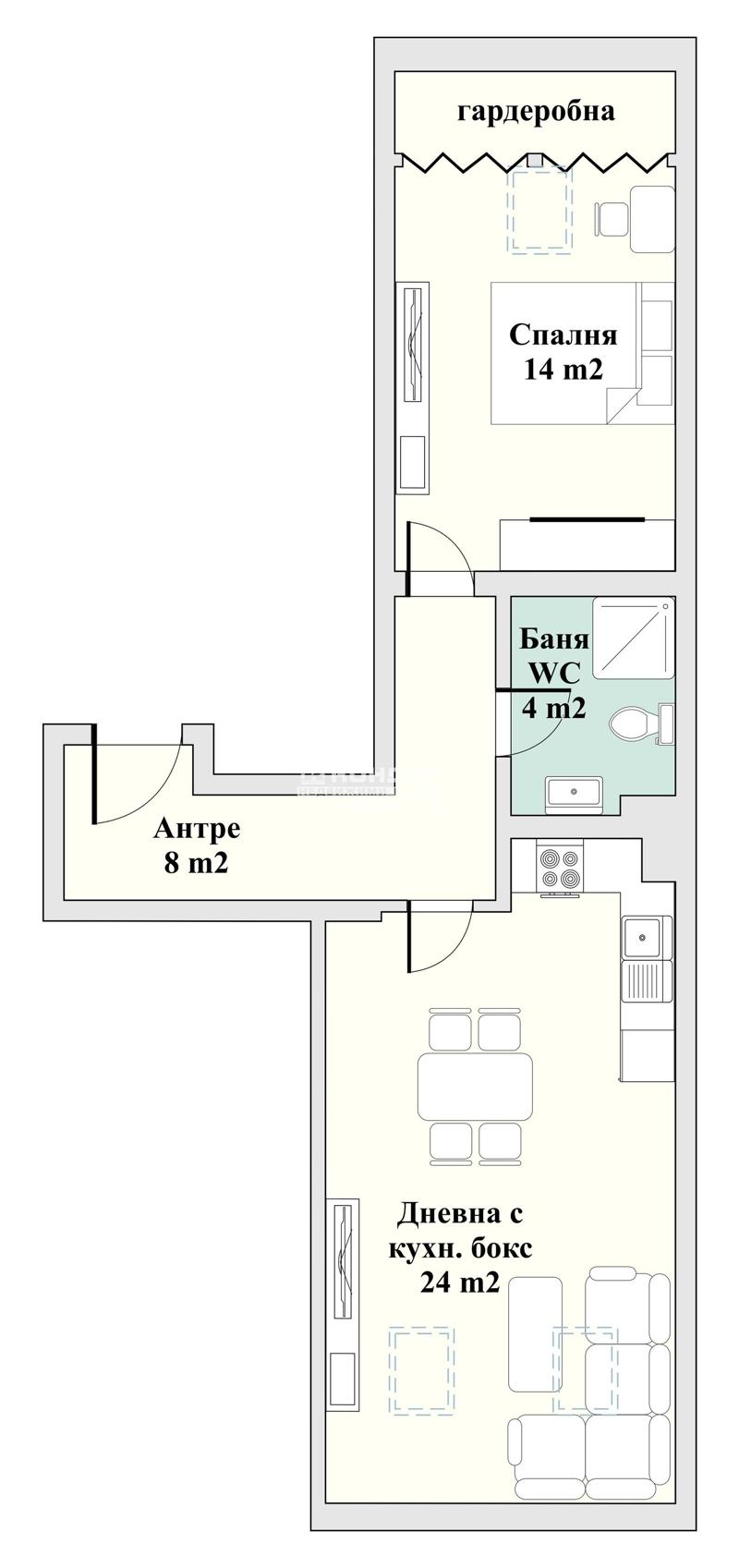Оферта 58132:Предлагаме на Вашето внимание двустаен апартамент в малка новоизградена сграда в подножието на Младежки Хълм и в близост до ВМИ. Нискоетажна сграда-тип Фамилна Къща със страхотна локация!!! Жилището се състои от панорамна и слънчева южна дневна с трапезария и кухненски бокс, една самостоятелна и непреходна спалня, баня с тоалетна и широко входно антре. Локацията - в близост до центъра на града, както и наличието в района на редица училища, детски градини, търговски и административни обекти допълнително внасят удобство в живота на модерния градски човек. Имотът е подходящ както за инвестиция, така и за живеене с възможност за Закупуване чрез Банков Кредит !!! Сградата е построена от строителна компания с доказан опит, като имат множество готови успешно завършени и издадени техни обекти през годините. Свободни Паркоместа във вътрешния двор, които ще бъдат покрити на цени от 18000 евро!!!